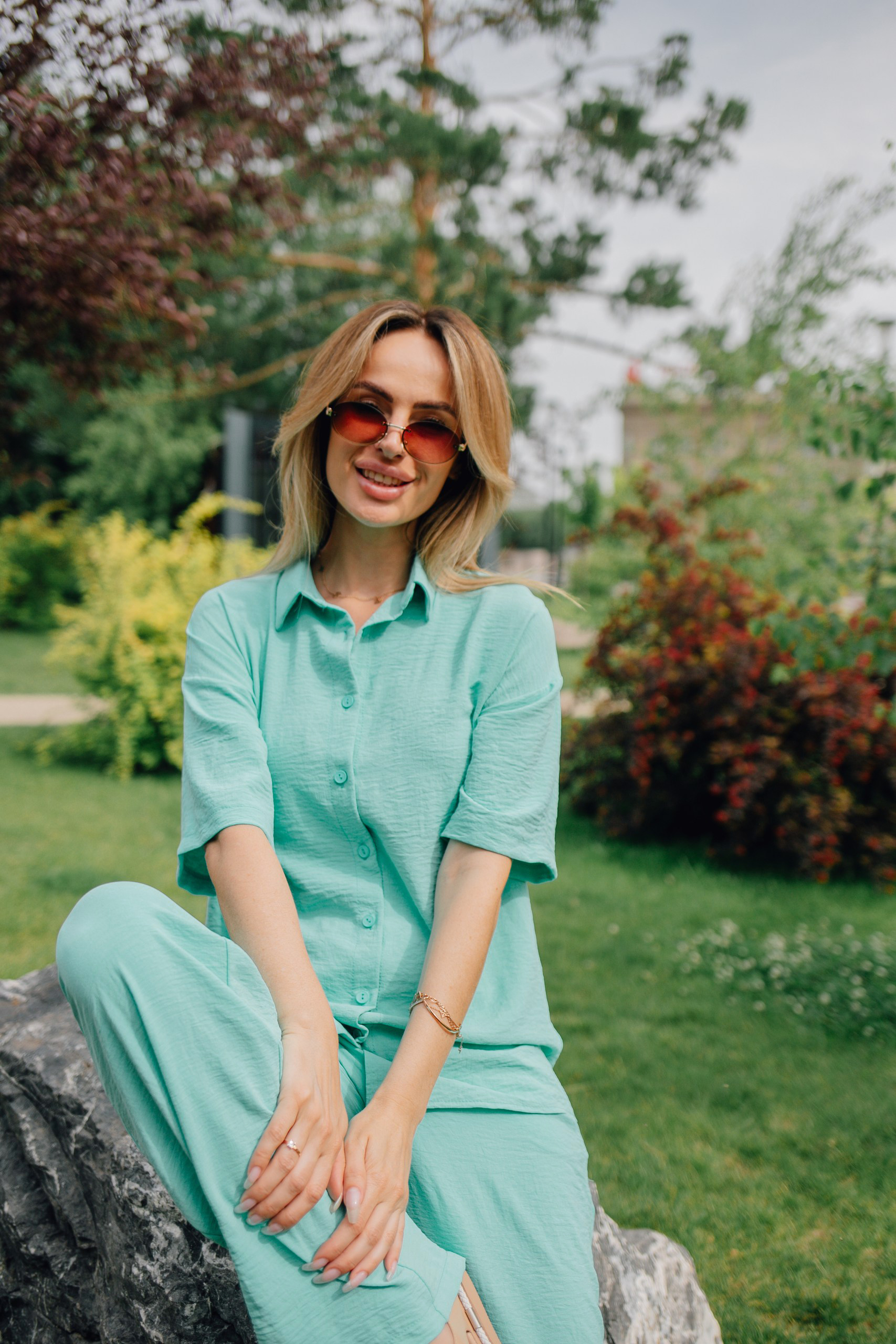 Легкий женский костюм с брюками и рубашкой оверсайз — простое и красивое решение на лето. Модель выполнена из фактурной ткани жатка, которая не мнётся и создает мягкий и свободный силуэт. Брючный костюм ментолового цвета сочетает комфорт и элегантность, позволяя чувствовать себя уверенно в любой ситуации.