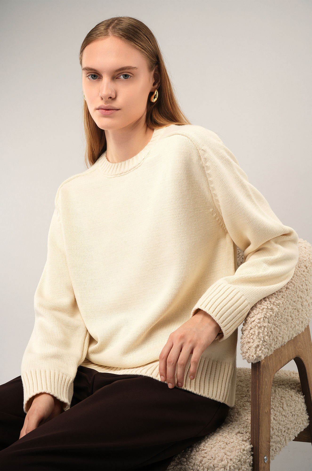 — однотонный джемпер молочного цвета отлично подходит для прогулок осенью и зимой, повседневных выходов и уютных вечеров дома.