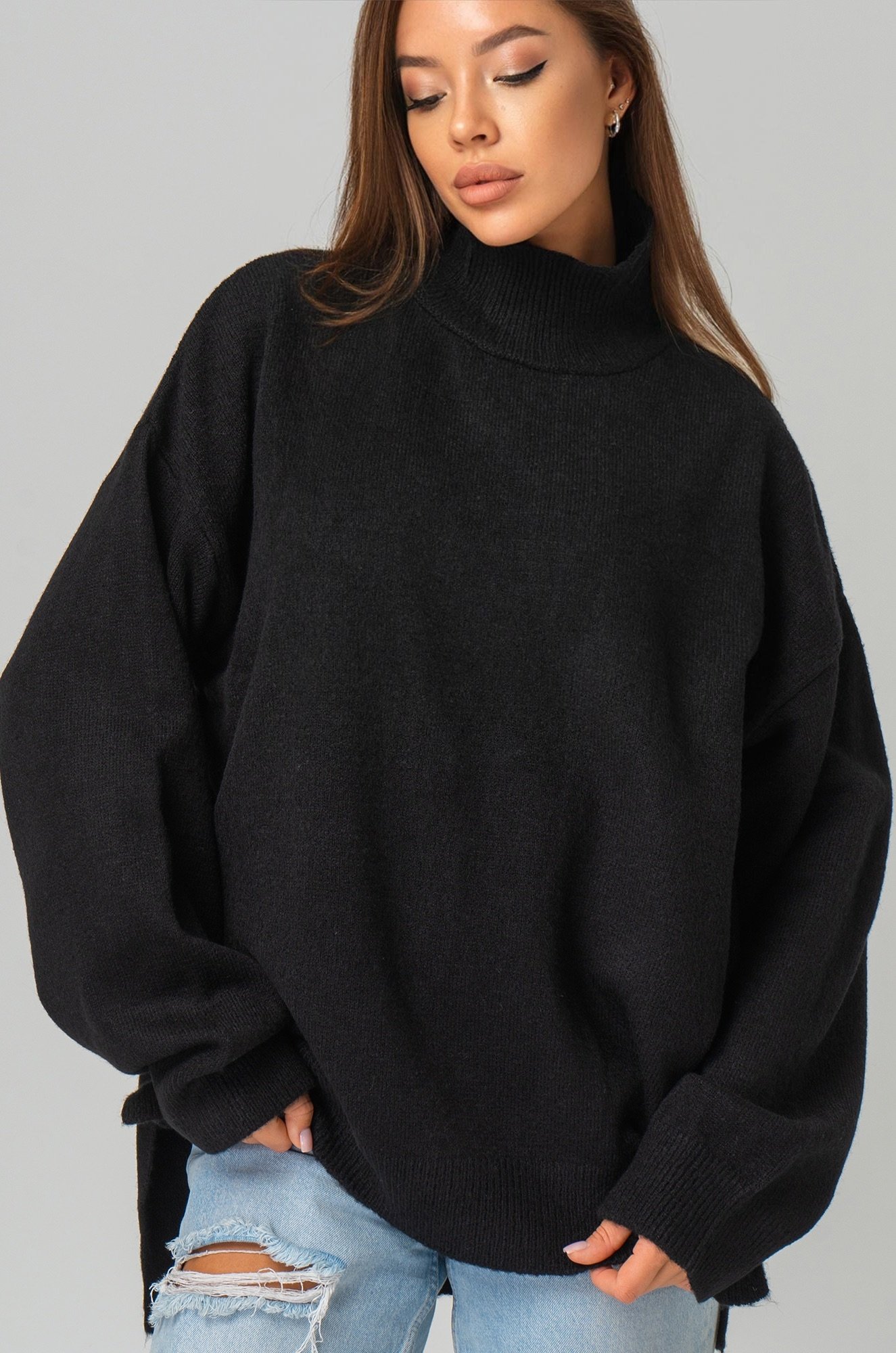 Однотонный свитер с горлом станет незаменимой частью зимнего гардероба. Широкие рукава и высокий ворот делают черный джемпер идеальным выбором для создания стильных и комфортных образов. По бокам имеются разрезы для удобства движений.