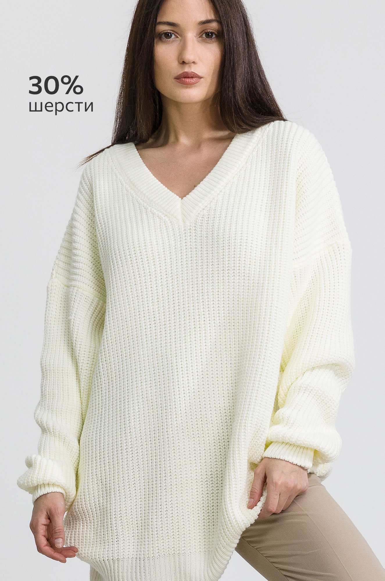 Женский удлиненный джемпер оверсайз с V-образным вырезом подчёркивает ключицы, аккуратно открывает шею, раскрывая изящность своей обладательницы. Благодаря свободному крою и минималистичному дизайну белый свитер oversize надолго сохранит свою актуальность.