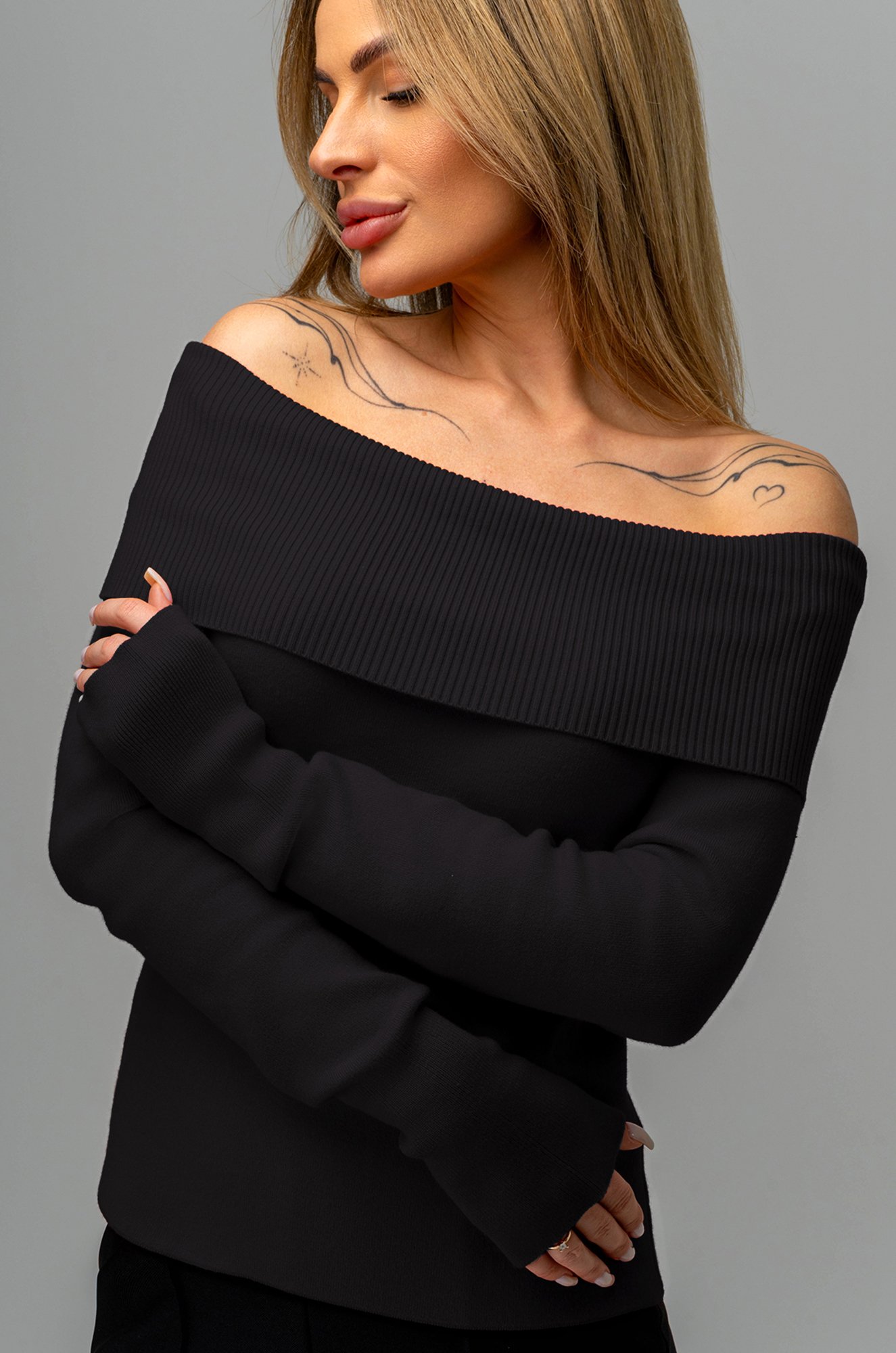Кофта имеет облегающий крой, который гармонично подчёркивает силуэт, создавая женственный образ. Прямой крой и открытые плечи добавляют элемент изысканности, а декольте с отворотом вносит деликатную нотку романтичности. Трикотажная демисезонная модель с длинным рукавом подходит для разнообразных решений.
