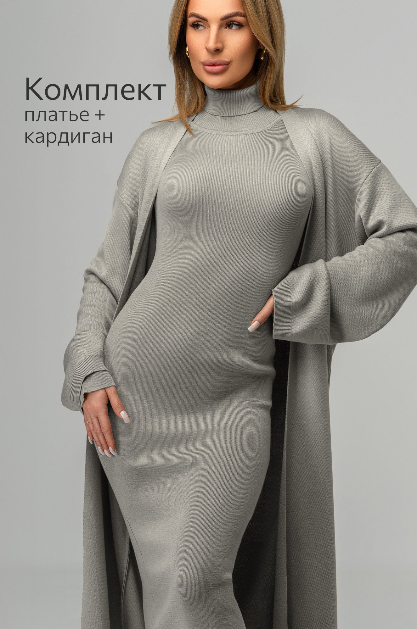 Женский комплект из платья и кардигана серого цвета — гармоничный дуэт для элегантного и уютного образа. Вязаный трикотаж в рубчик и продуманный крой создают целостный и благородный силуэт на каждый день.