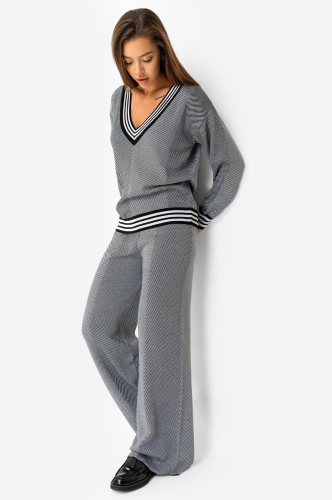 Женский вязаный костюм в бежевых оттенках с диагональной полоской — это сочетание комфорта, актуального дизайна и элегантности.