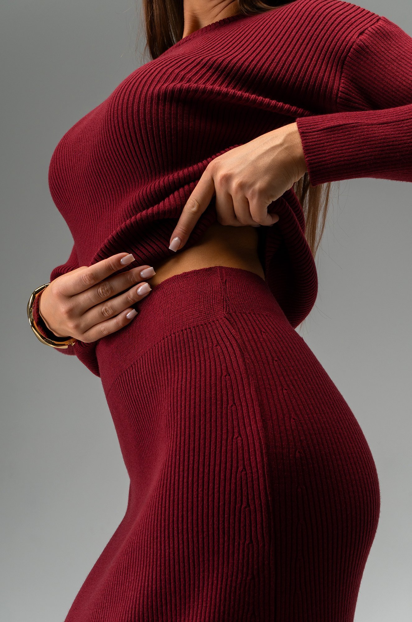 Женский костюм из мягкого вязаного трикотажа в рубчик — воплощение элегантности и уюта для прохладных дней. Джемпер прямого кроя с длинным рукавом и спущенным плечом дарит полную свободу движений, а круглая горловина добавляет образу классической сдержанности. Длинная юбка макси на мягкой резинке подчеркивает женственность и грациозность, создавая гармоничный силуэт.