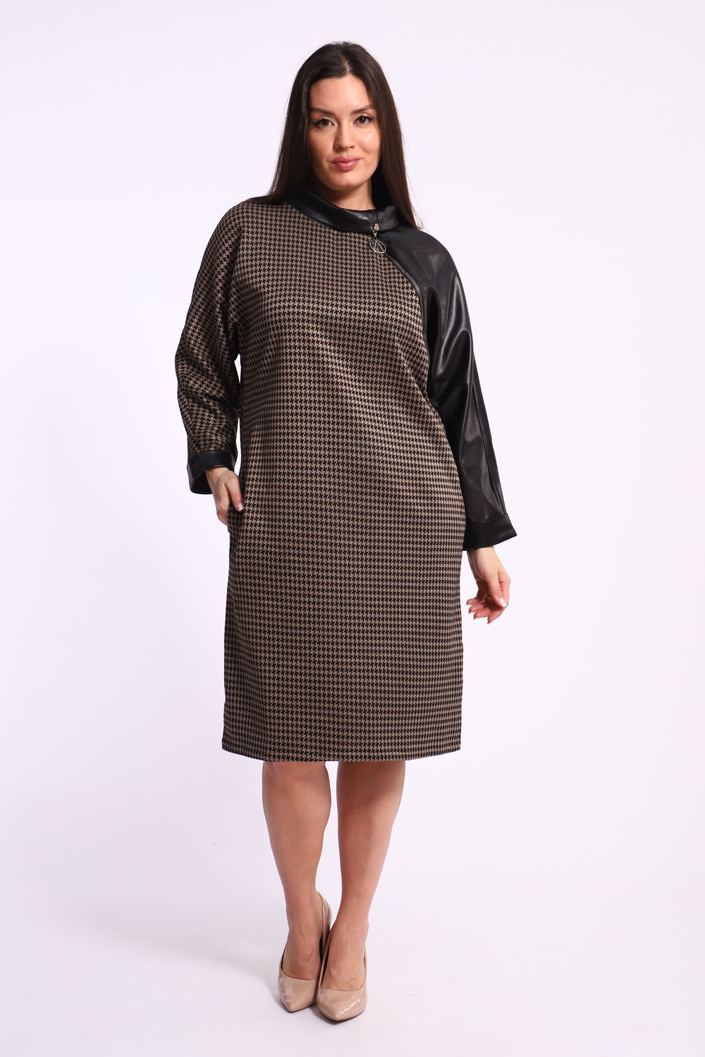 Откройте для себя мир изысканной моды с нашим женским платьем со спущенным рукавом и модным принтом гусиные лапки. Это платье станет вашей надежной основой для создания элегантного и современного образа. Его уникальный дизайн прекрасно сочетается с отделкой из качественной эко-кожи, добавляя нотки роскоши и утонченности.