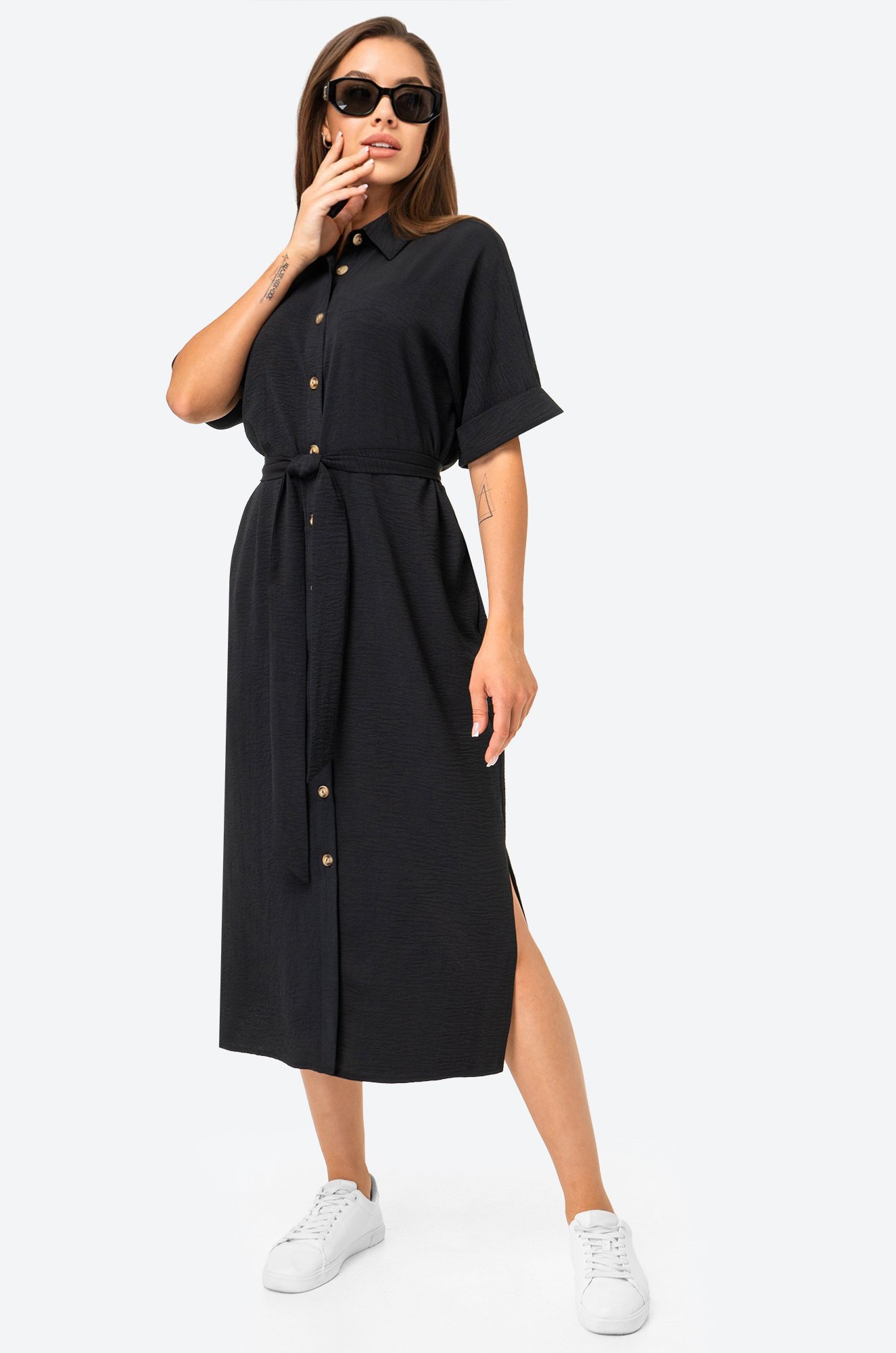 Черное платье-рубашка с удлиненным рукавом с подворотом – отличное решение для лета, платье из вискозы прекрасно подходит для отдыха на пляже или прогулок летом. Для удобства передвижения по бокам предусмотрены глубокие разрезы, в боковых швах расположены карманы.