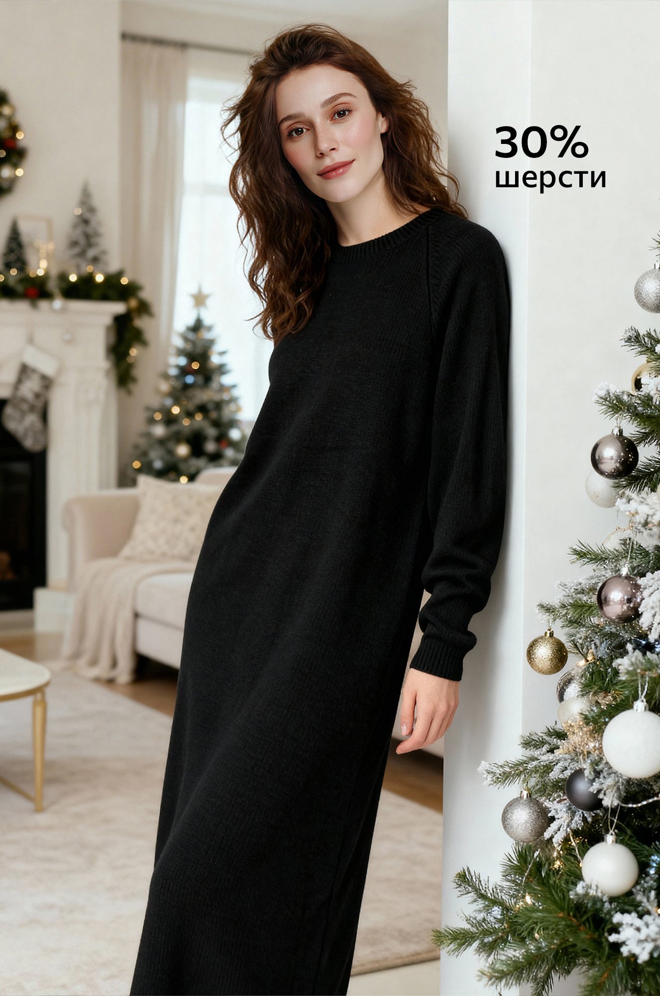 Черное женское платье выполнено из вязаного трикотажа с добавлением шерсти. Шерсть отличается естественным теплом и невероятной мягкостью.