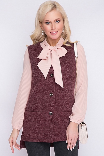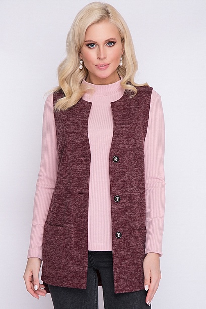 Жилет из плотного трикотажного полотна прямого силуэта с разрезами по бокам,с накладными карманами,и центральной застежкой на петли и пуговицы.