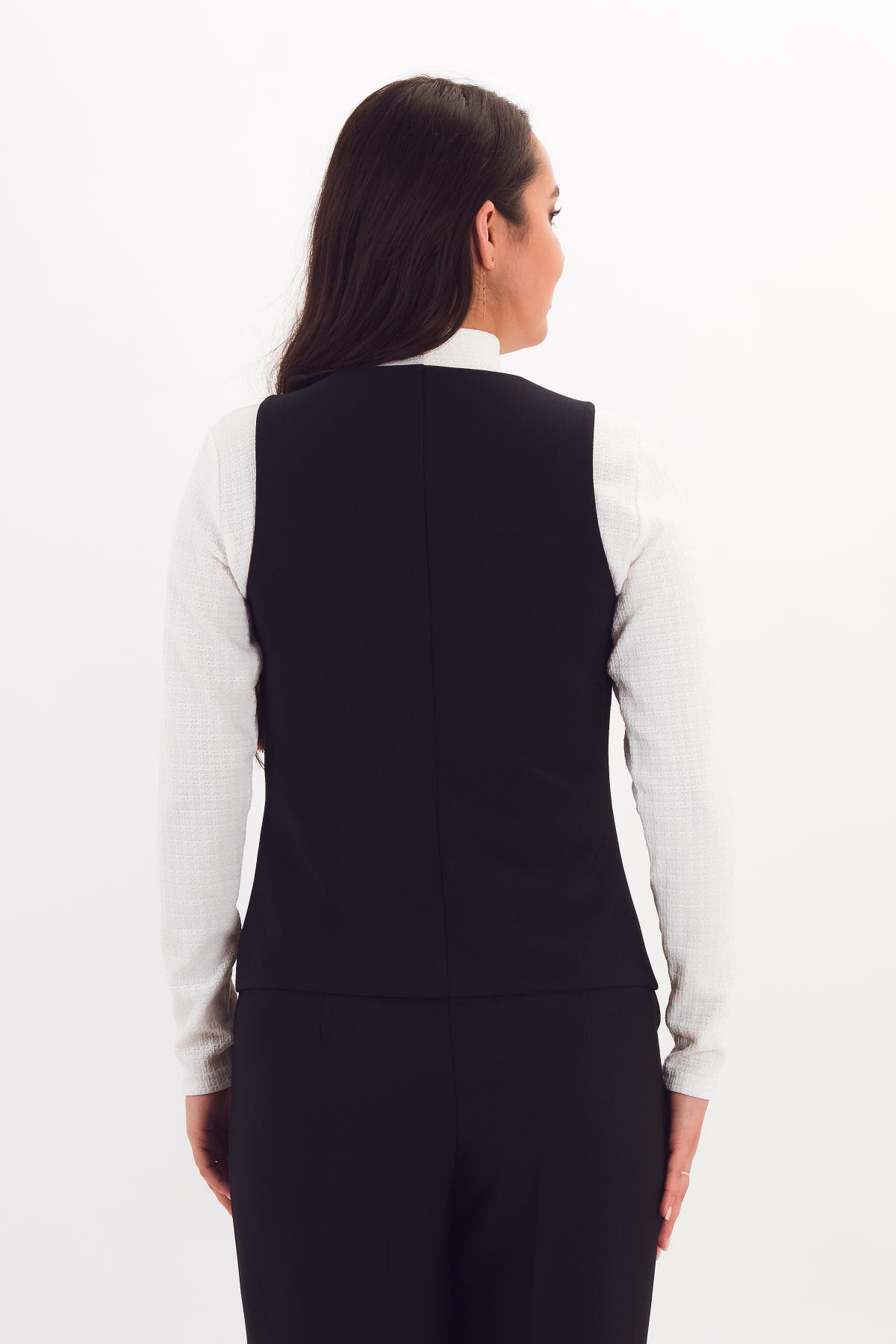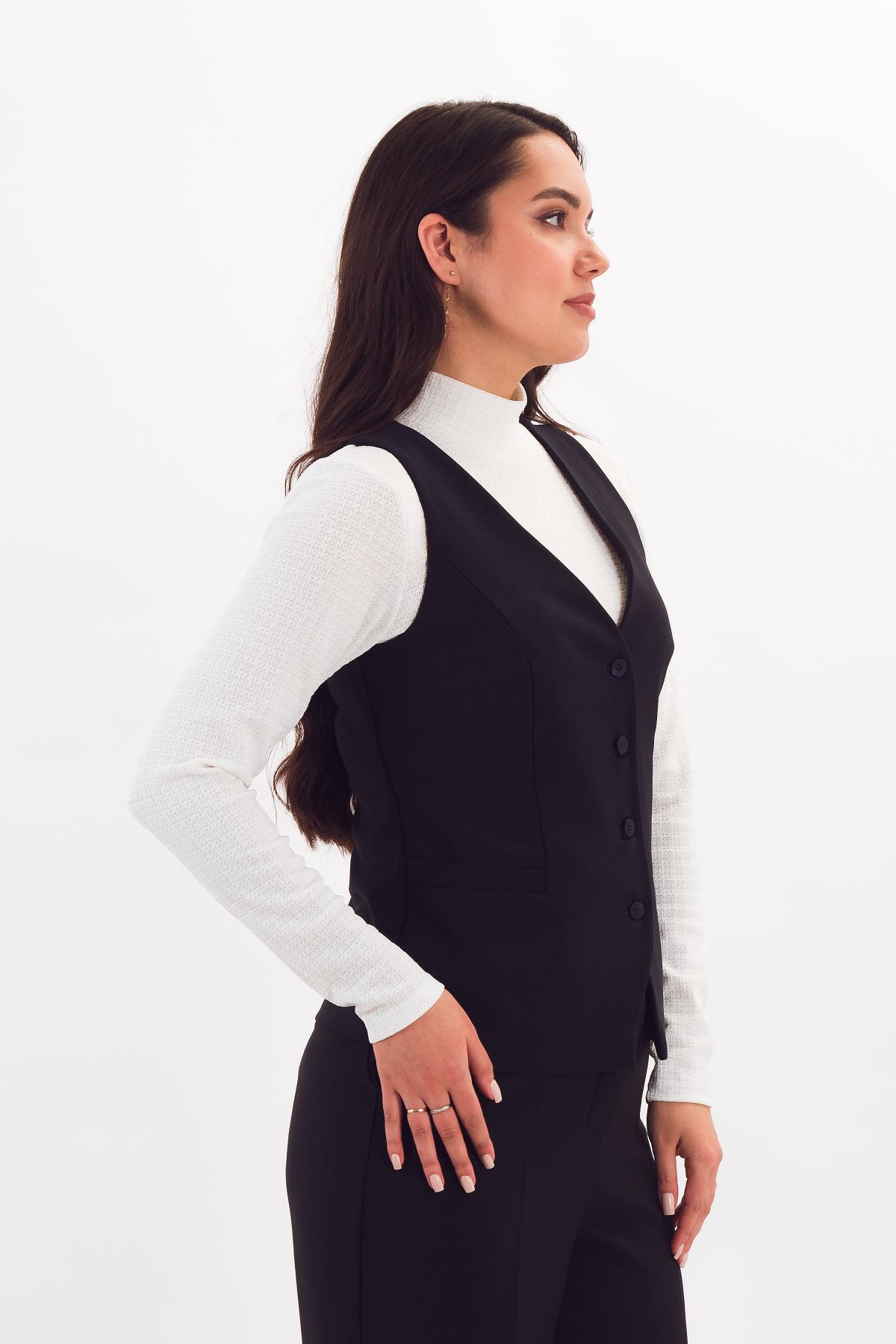 Описание: Классический жилет с V-образным вырезом и треугольными рельефами рисует женственный силуэт и зрительно стройнит. Удобные карманы с листочками закрыты подкладом по детали переда.