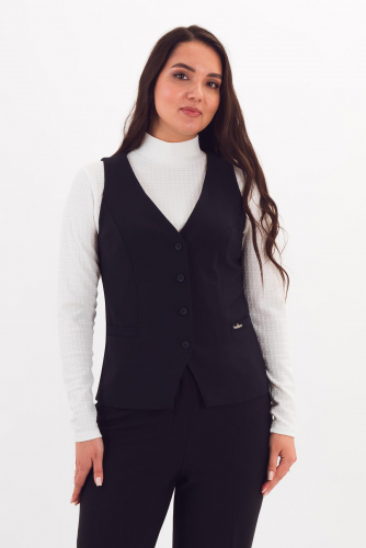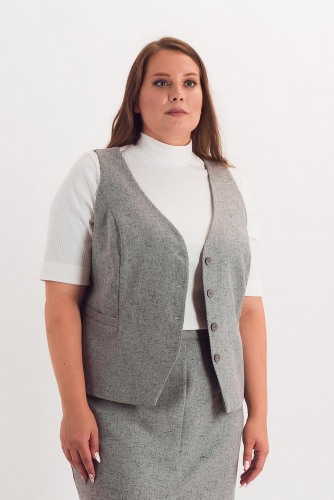 Описание: Классический жилет с V-образным вырезом и треугольными рельефами рисует женственный силуэт и зрительно стройнит. Удобные карманы с листочками закрыты подкладом по детали переда.