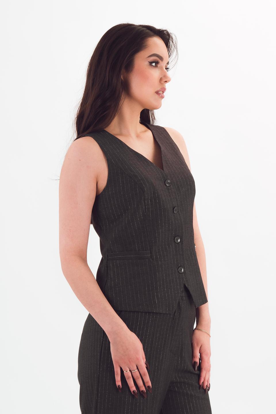 Описание: Укороченный классический жилет с V-образным вырезом и треугольными рельефами рисует женственный силуэт и зрительно стройнит. Удобные карманы с листочками позволят иметь необходимые мелочи под рукой. Мягкая подкладочная ткань приятна к телу.