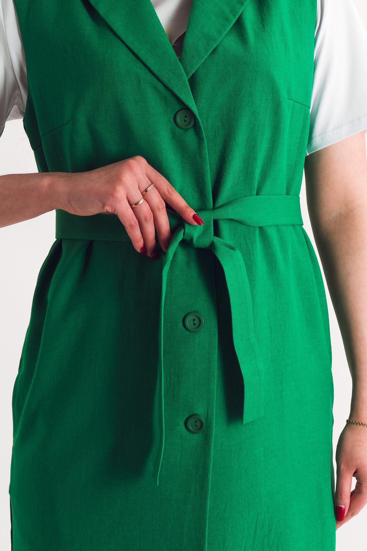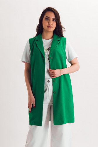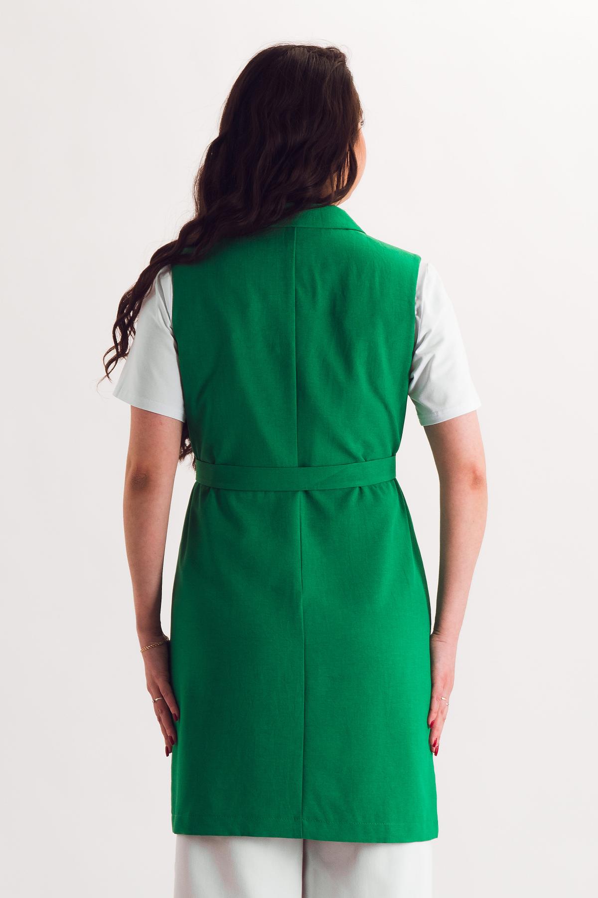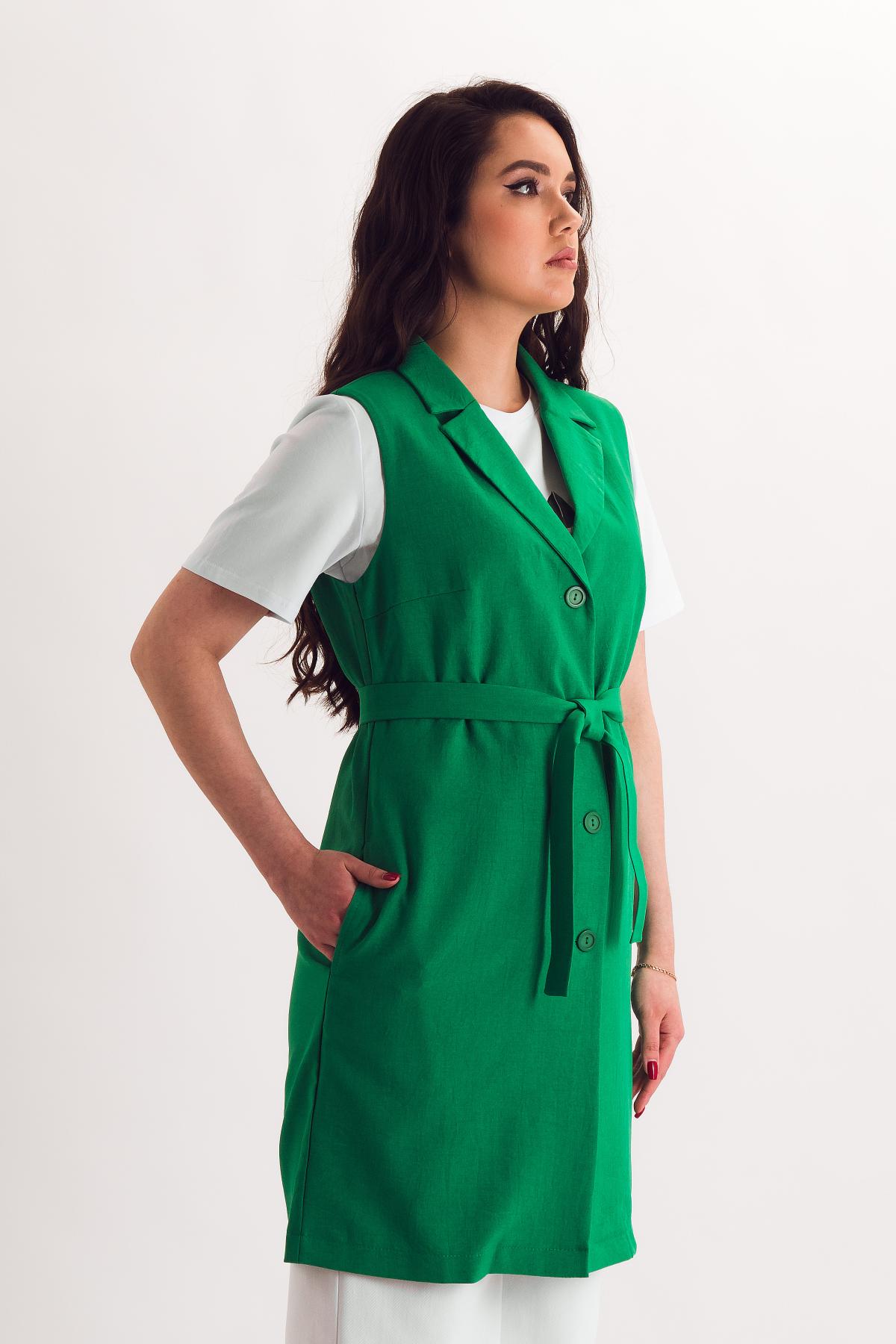 Описание: Стильный удлиненный жилет длиной выше колена подойдет как для классического, так и для casual-образа. Отложной воротник и функциональные карманы в боковых швах. Завязывающийся пояс в комплекте.