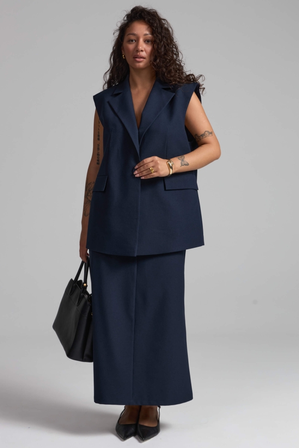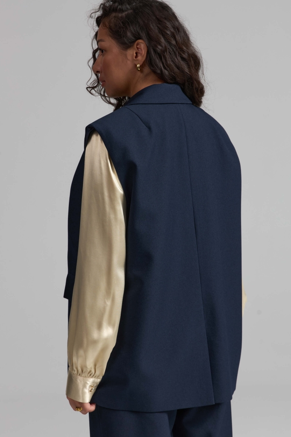 Жилет однобортный свободного кроя на подкладе, с пиджачным воротником и застежкой на одну петлю и пуговицу. По переду карманы с клапаном, по спинке средний шов и шлица.