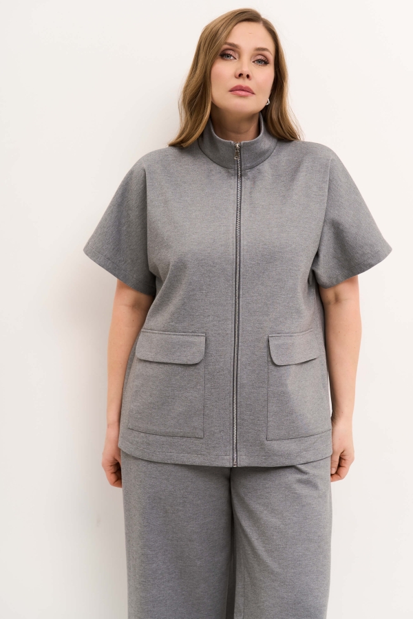 Жилет из плотного трикотажа. Модель свободного силуэта со стойкой. По переду застежка на металлическую молнию и накладные карманы с клапанами. Рукав цельнокроенный, спущенный.