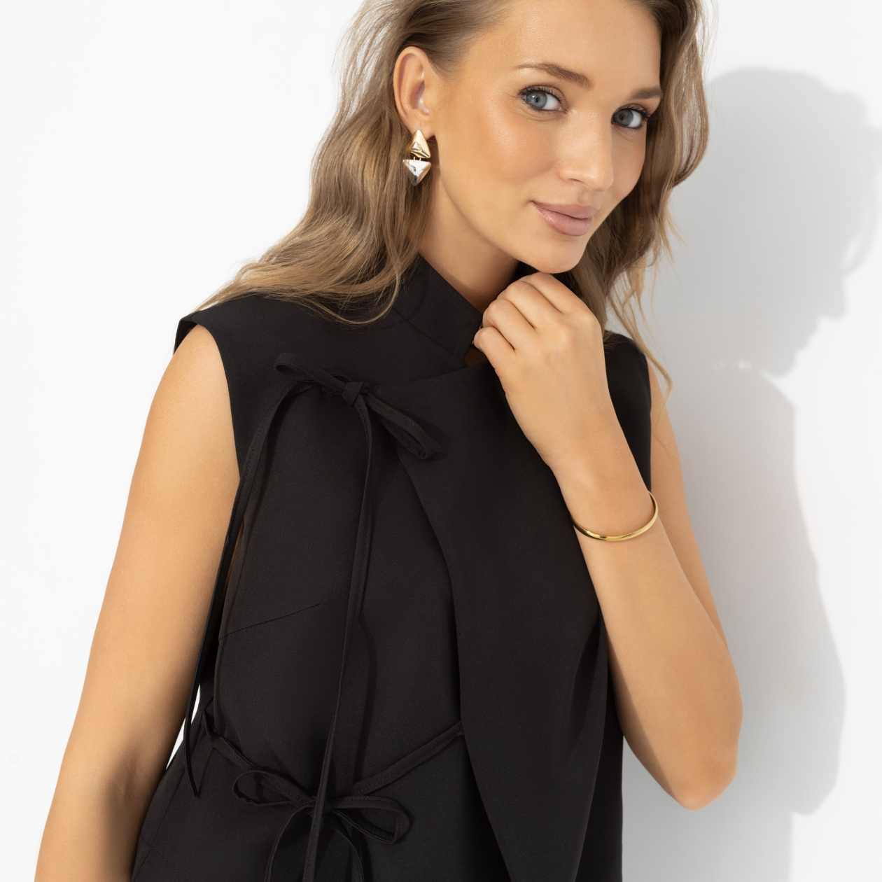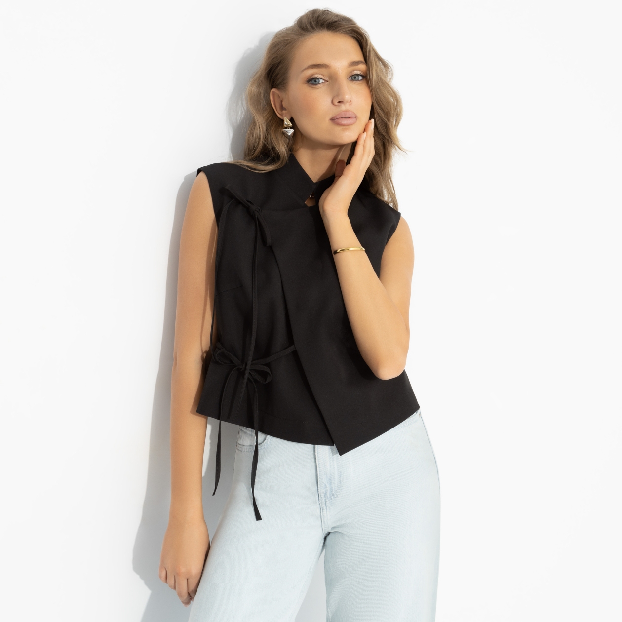 Иногда лучшая реплика – это внешний вид. Она хотела добавить «что-то интересное» – и нашла аргумент сильнее слов. Жилет с выразительными завязками делает образ собранным и чуть дерзким – ничего лишнего, только прямая речь через эффектную форму. Лаконичный, как точная цитата, он подчёркивает характер. И даже пауза звучит эффектно.