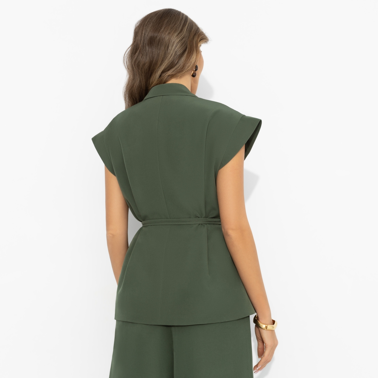 Бывает ли у одежды магия? Отвечаем: «да», и она зелёного цвета. Оттенок жилета чарует, линия плеч собирает восторги, а пояс подчёркивает талию. Надела – и эффект «слишком модно» включился сам. Жилет выполнен из пластичной ткани, красиво держит форму и мягко повторяет движения. Свободный крой балансируется поясом – можно носить приталенно или расслабленно. Идеален в комплекте с брюками, джинсами или поверх платья. Ткань приятна к телу и комфортна в течение дня.