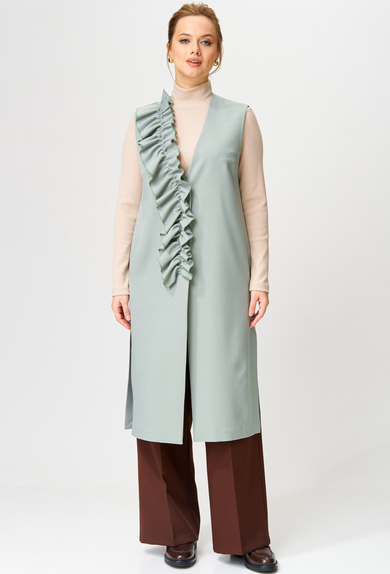 Модель: Гизарт 15329 хаки Рост: 1..показать64 см (рост модели на фото 170см) Сезон: Круглогодичный Тип ткани: Полиэстер 100%Жилет прямого силуэта из мягкой костюмной ткани. Перед с нагрудной вытачкой. Застежка центральная однобортная на 2 петли и пуговицы. Вдоль правого борта от плечевого шва до линии бедер настрочен декоративный волан. По низу боковых швов разрезы. В боковых швах карманы. Спинка со средним швом.