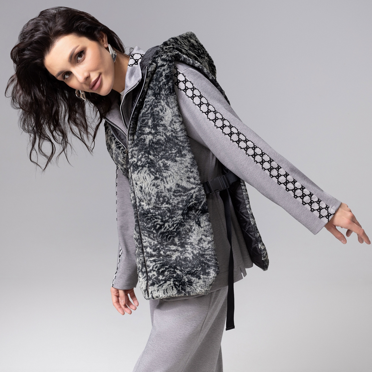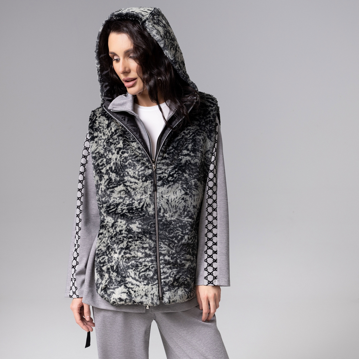 Жилет из экомеха шиншиллы сочетает в себе экстравагантный крой и уютную теплоту, создавая эффектный образ современной элегантности. Модель с объемным капюшоном подчеркивает мягкость линий и добавляет образу динамичный, стильный акцент. Безупречный пошив проявляется в идеальной посадке и тщательной обработке швов, обеспечивающих долговечность носки. Этот жилет, выполненный из премиального текстурного материала, становится акцентным элементом гардероба, который подчеркивает индивидуальность и чувство стиля своей обладательницы. Жилет на стёганом подкладе с капюшоном. Застежка на молнию. Можно носить как верхний, и как нижний слой под верхнюю одежду. Ширина изделия регулируется по бокам.