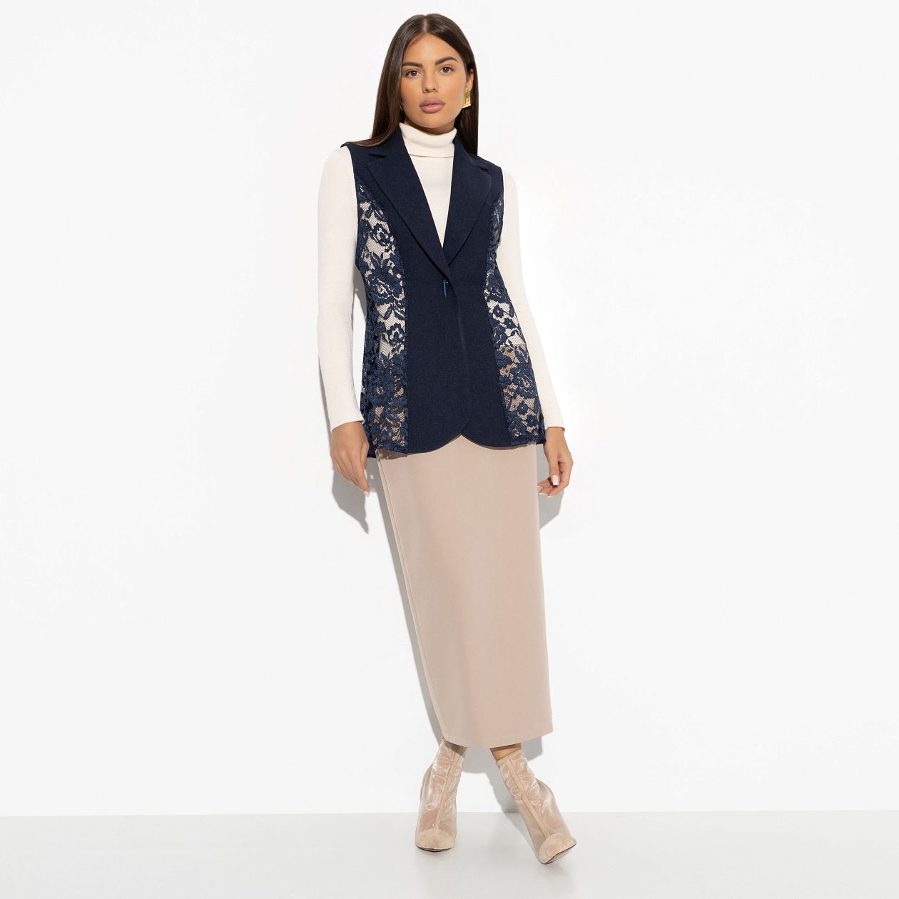 Проведенный среди мужчин опрос показал, что из всех видов ткани, кружево считается максимально привлекательным материалом. Не то, чтобы мы этого не знали, но выводы сделаем. Будем носить кружево на работу в виде жилета ЧАРУТТИ. Жилет приталенного силуэта с лацканами глубокого синего цвета. Застегивается на акцентную пуговицу. Длина изделия чуть ниже линии бедра.