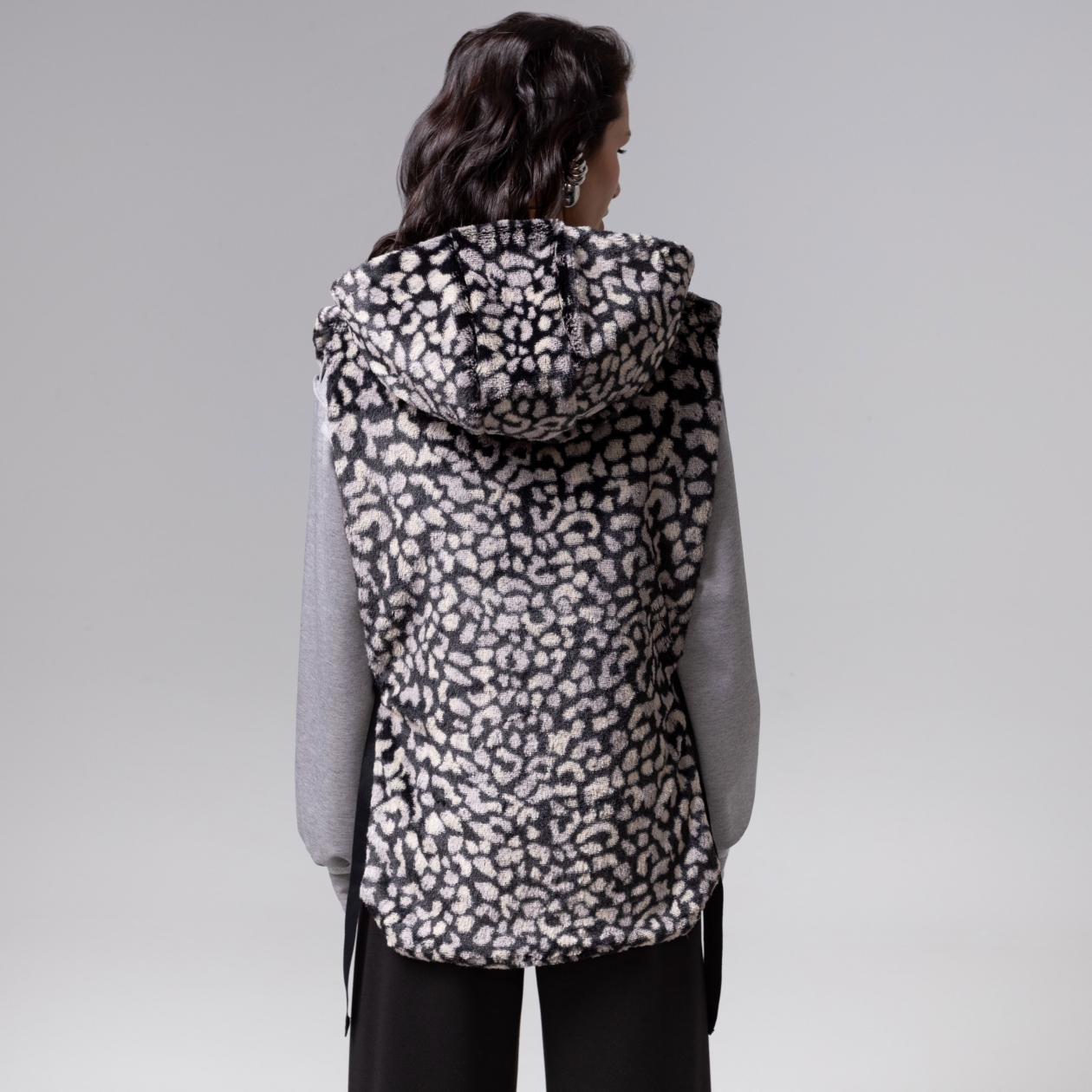 Жилет ЧАРУТТИ из экомеха с трендовым леопардовым принтом воплощает дерзкую элегантность. Экстравагантный крой и дикий узор создают смелый стильный акцент. Изделие с объемным капюшоном подчеркивает динамику силуэта, добавляя образу ноту современной роскоши и непринужденного шика. Безупречный пошив проявляется в виртуозном совмещении принта, идеальной посадке и тщательной обработке деталей, обеспечивающих комфорт в носке и долговечность изделия. Жилет на стёганом подкладе. Застежка на молнию. Можно носить как верхний, и как нижний слой под верхнюю одежду. Ширина изделия регулируется по бокам.