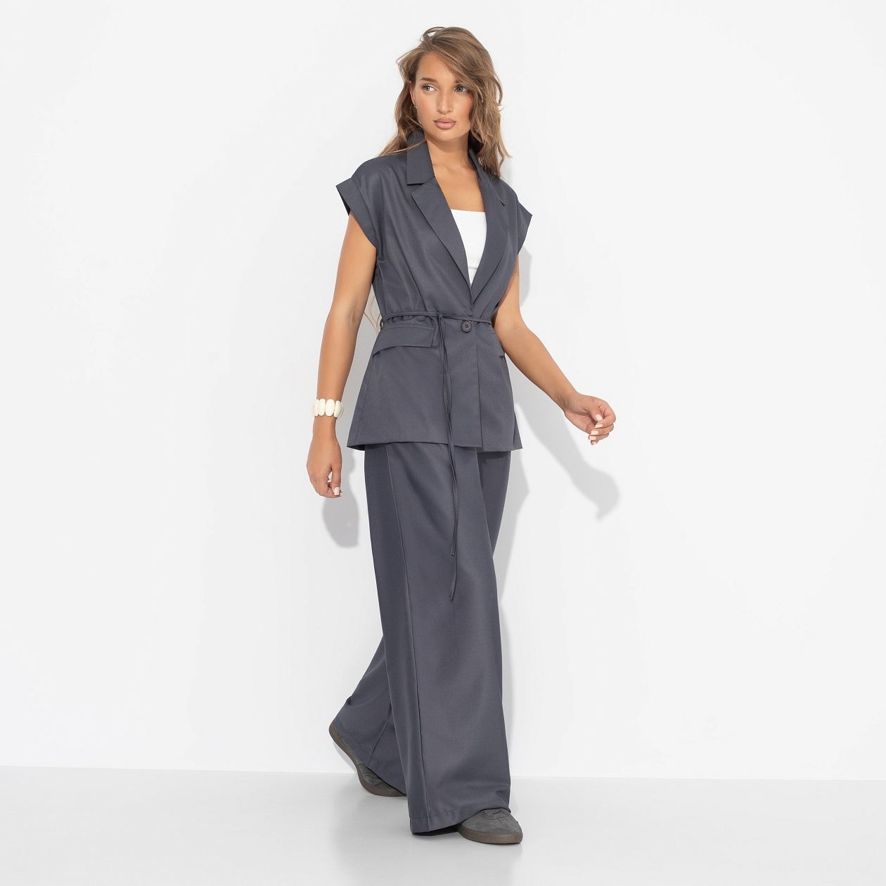 Из clean girl в бизнес-леди за пару секунд. Жилет ЧАРУТТИ в глубоком сером цвете преобразит тебя и подарит окружающим уверенность в твоём всемогуществе. Решение любых вопросов в кратчайшие сроки – это к тебе и к ЧАРУТТИ. Жилет удобренный с лацканами. Имитация карманов. Изделие застегивается на пуговицу в тон материала. Спущенная линия плеча, отвороты прошиты. Жилет можно носить как второй слой или в качестве самостоятельного предмета гардероба.