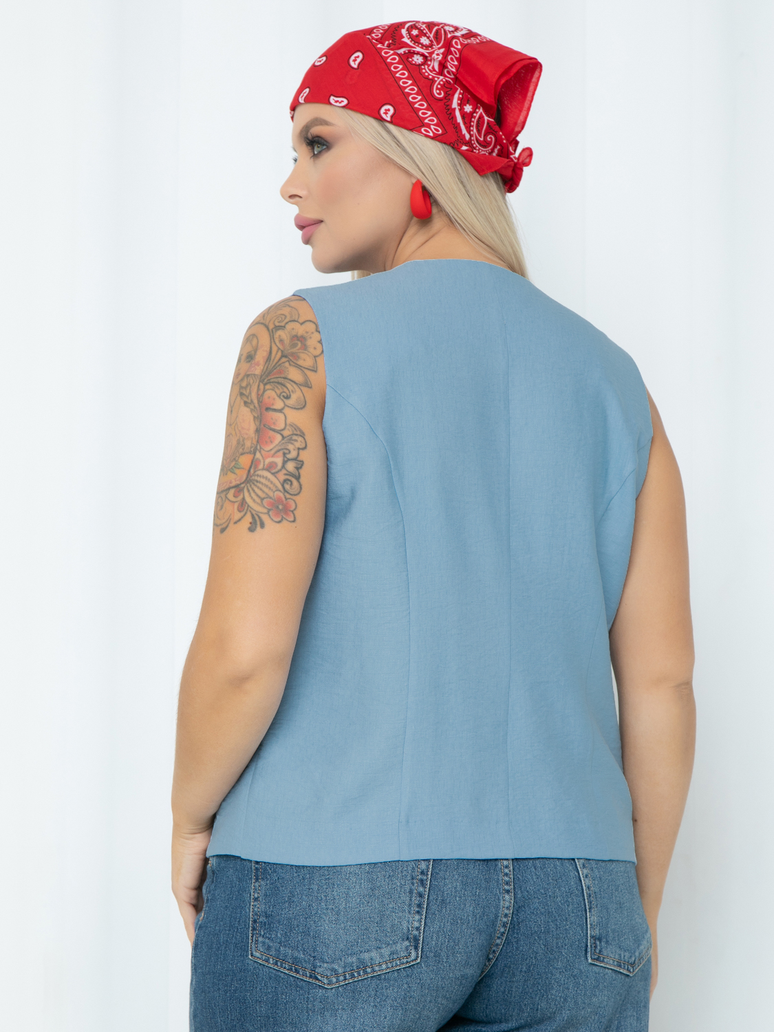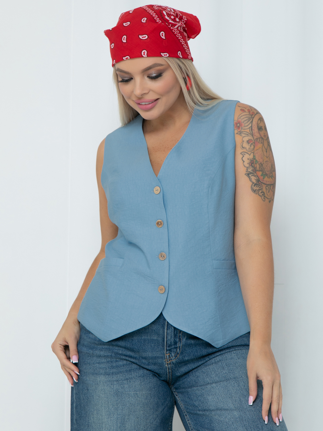 Жилет из ткани с льняной фактурой серо-голубого цвета.