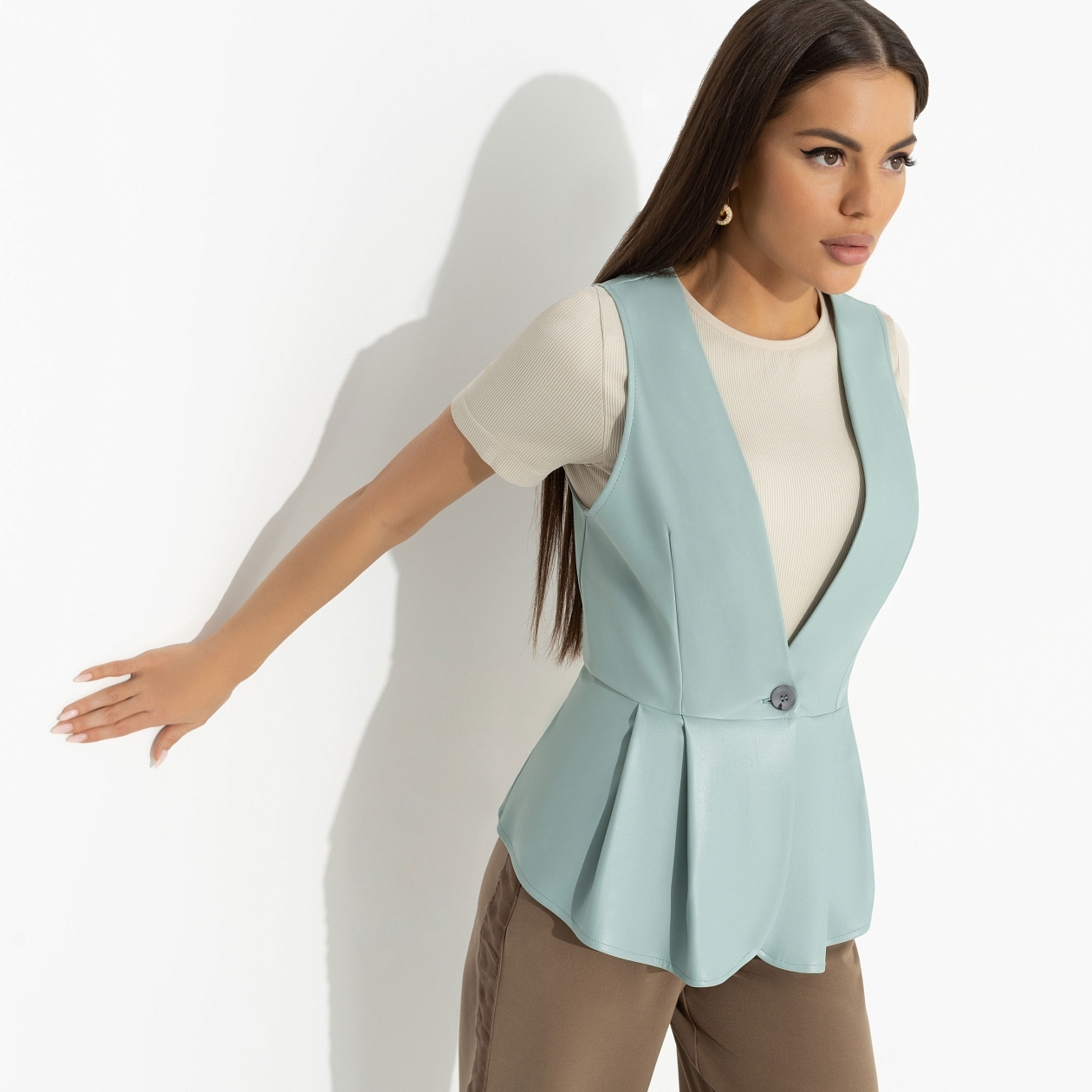 Жилет, который ощущается как исполнившаяся мечта. Тихая или громкая радость, поддержка близких и мурашки по коже – все это идет в комплекте к жилету CHARUTTI. Жилет из экокожи приталенного силуэта. Асимметричный подол изделия. Жилет застегивается на пуговицу. Легкая баска по спинке изделия.