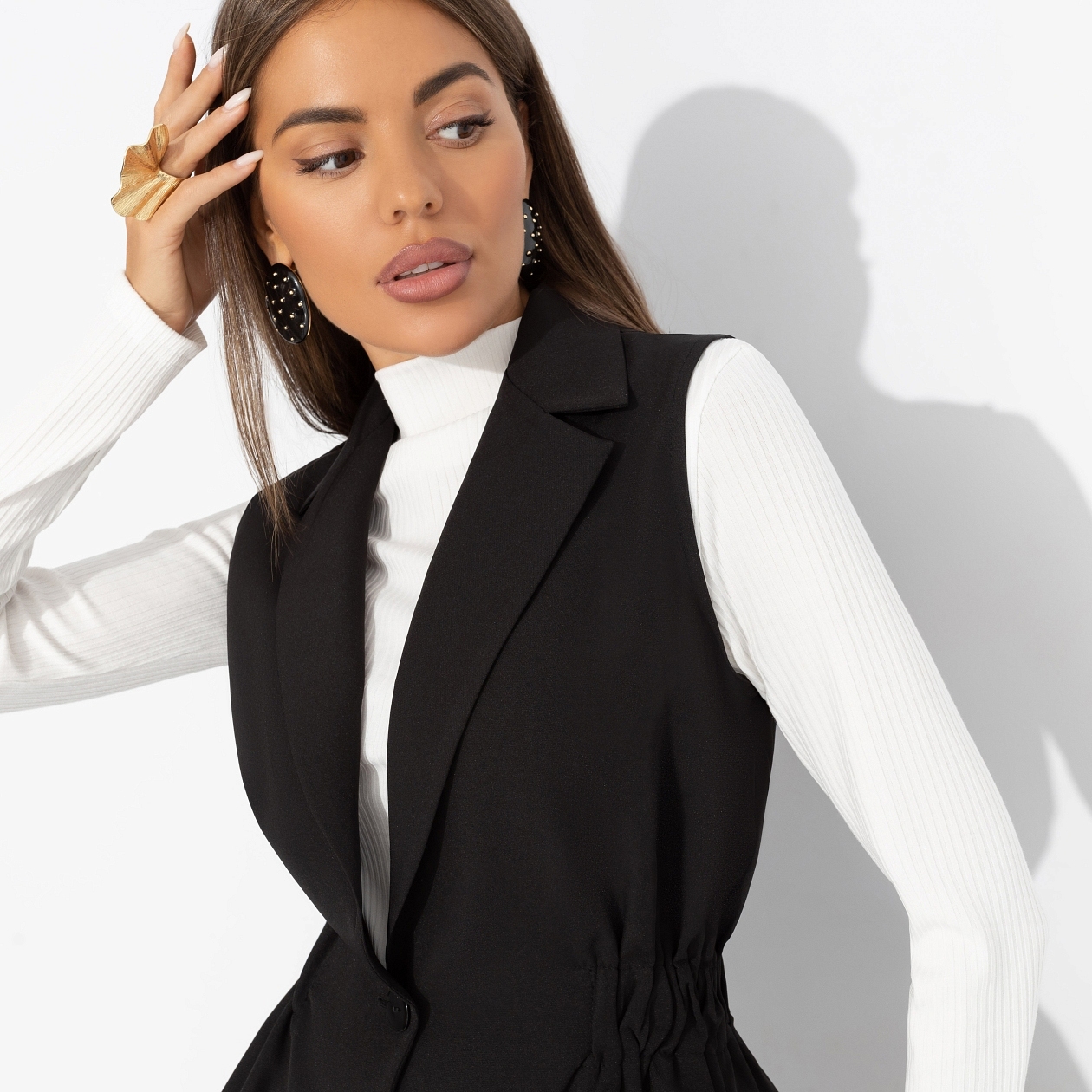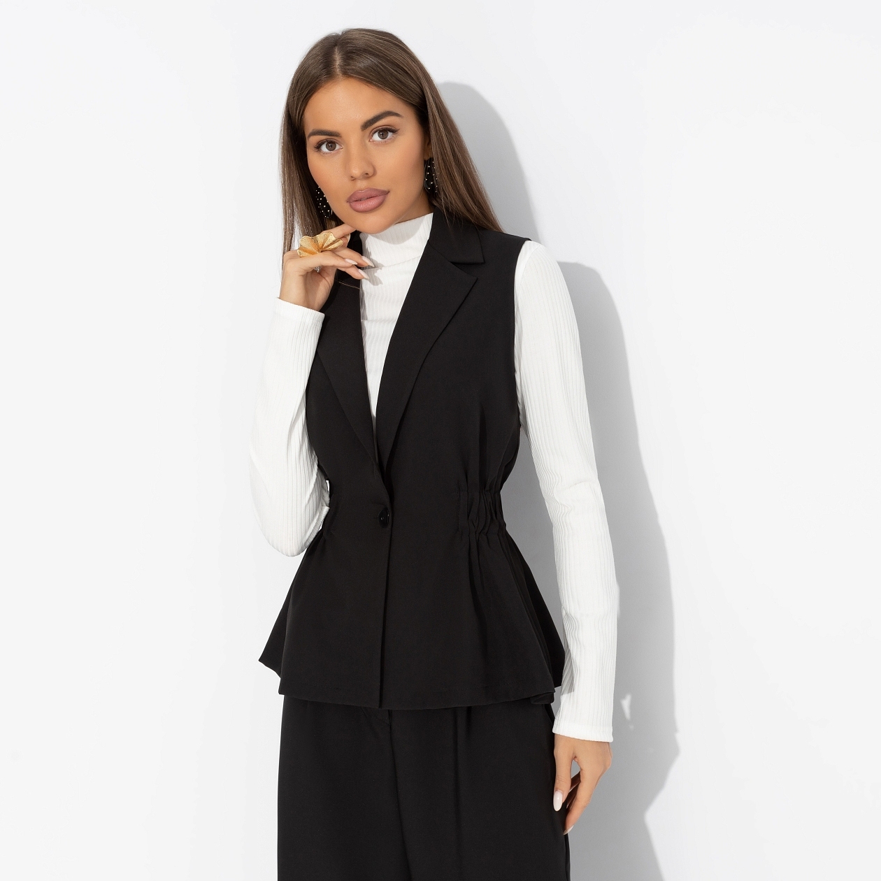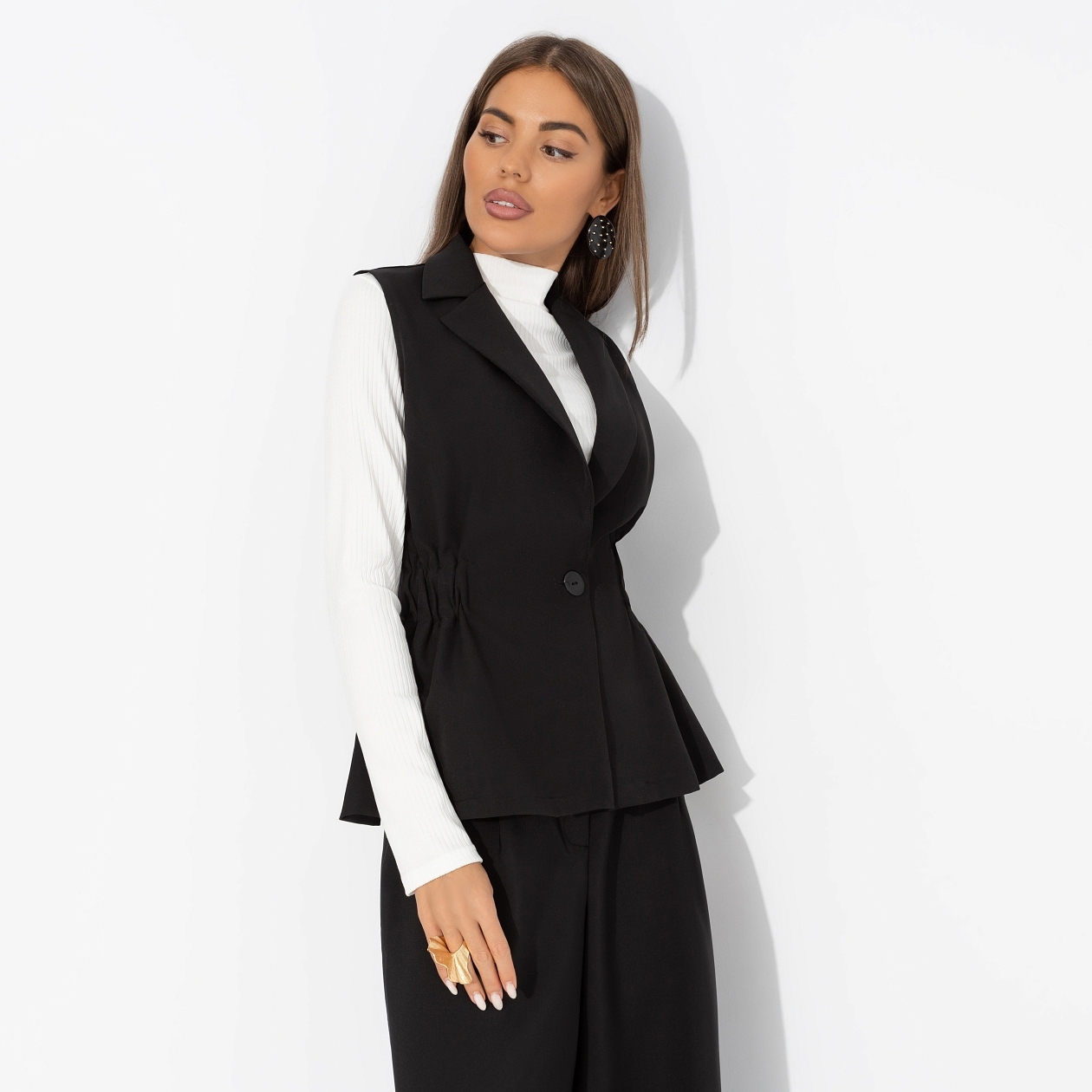 Скроен по фигуре, создан по характеру. Этот чёрный жилет знает, чего он хочет – и знает, чего хотите вы. Мягкая ткань не сковывает движений, ведь твой день – это марафон, где важно успеть обнять, решить и вдохновить. Жилет приталенного силуэта с лацканами. Линия талии выделена скрытой резинкой. Изделие застегивается на пуговицу.