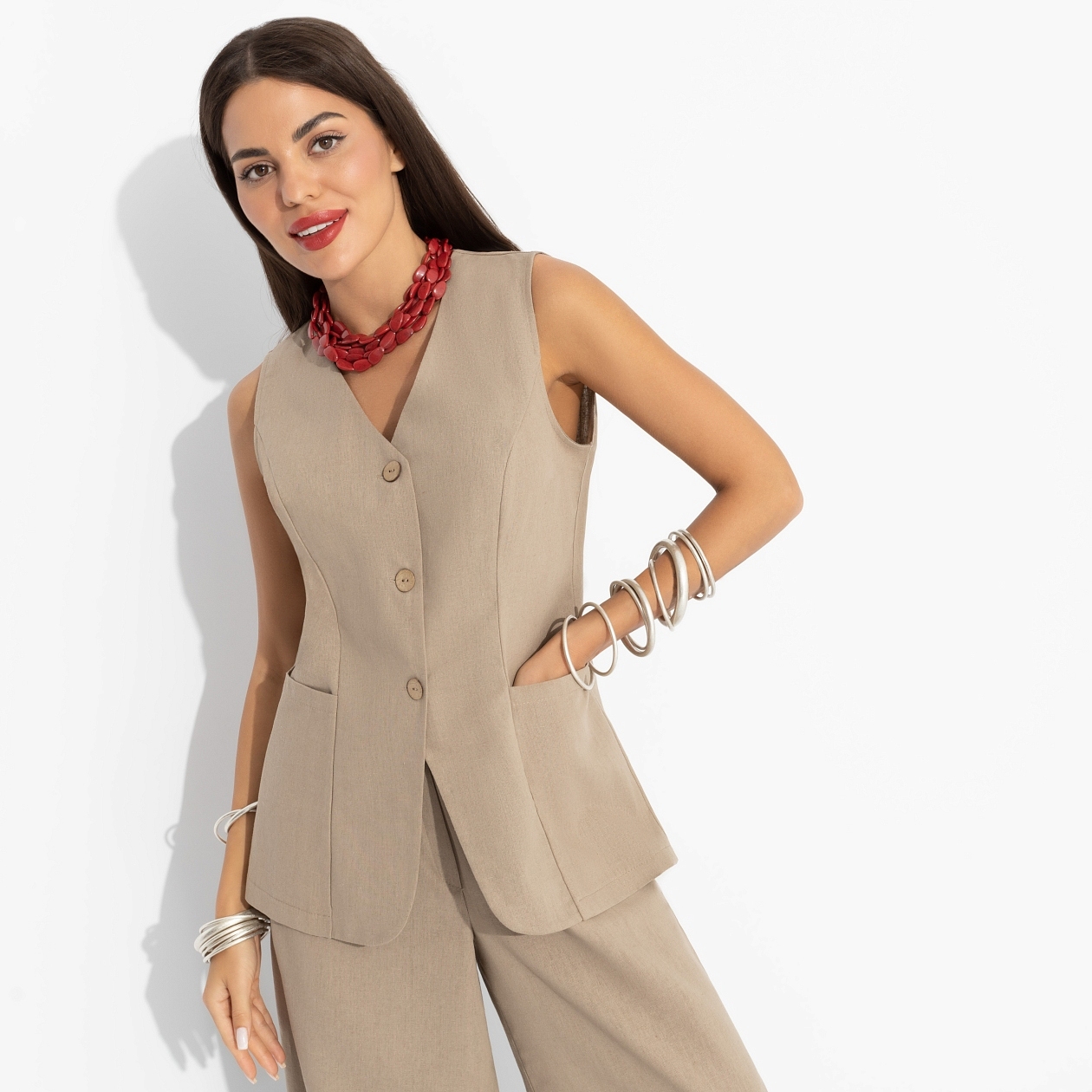 Мысли перед сном только о нем. О жилете в цвете овсяного печенья. Будоражит и заставляет сердце биться чаще, когда вы представляете, как стилизуете его со всем своим гардеробом. Мурашки по коже от модных возможностей жилета CHARUTTI. Жилет на пуговицах, удлиненный. Изделие приталенного силуэта, с карманами. Можно носить как второй слой и как самостоятельный предмет гардероба.