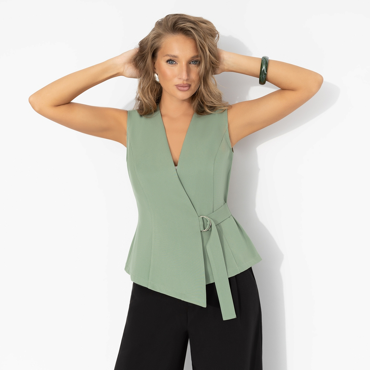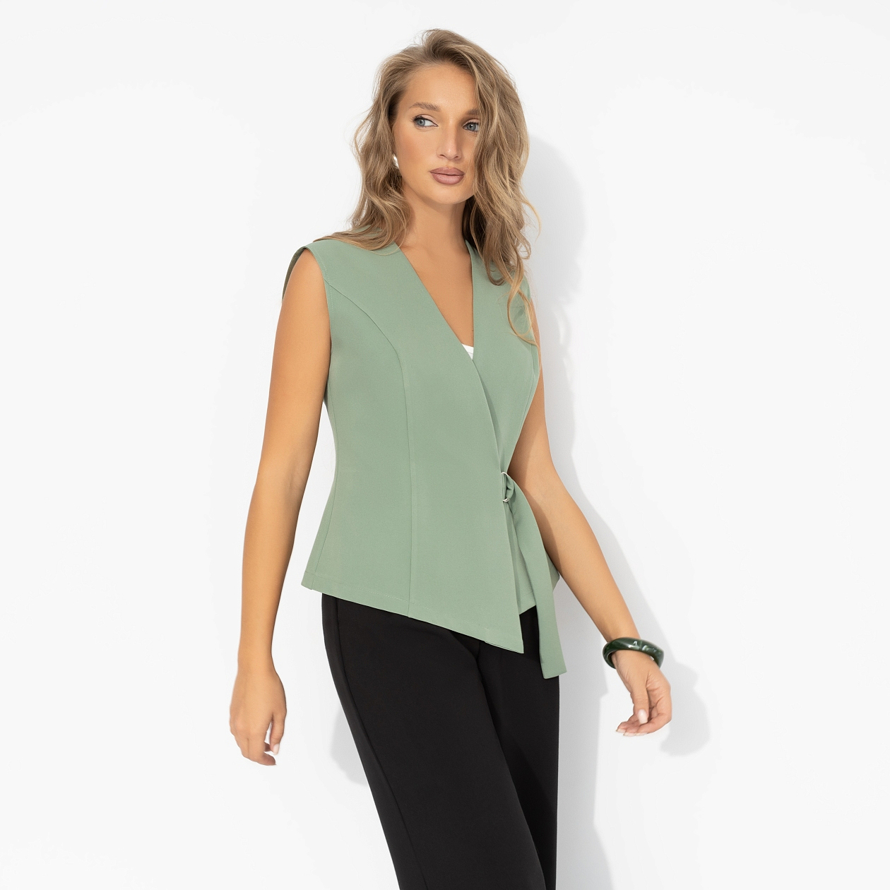 Сделай шаг навстречу новому дню. Мягкий оттенок оливы создает образ спокойной уверенности. А асимметричный крой и пояс с кольцом подчеркивают характер и современный ритм. Жилет из костюмной ткани за запах. Силуэт приталенный. Пояс регулируется.