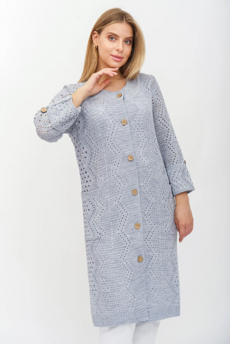 Женский вязаный жилет на пуговицах с карманами. Теплая жилетка выполнена из высококачественной пряжи с составом 30% шерсть 70% ПАН. Жилет имеет круглый вырез горловины и функциональные накладные карманы.  Модель полуприлегающего силуэта подойдет для любого типа фигуры и составит модный и интересный образ с любым низом: брюки, джинсы, юбка. индиго