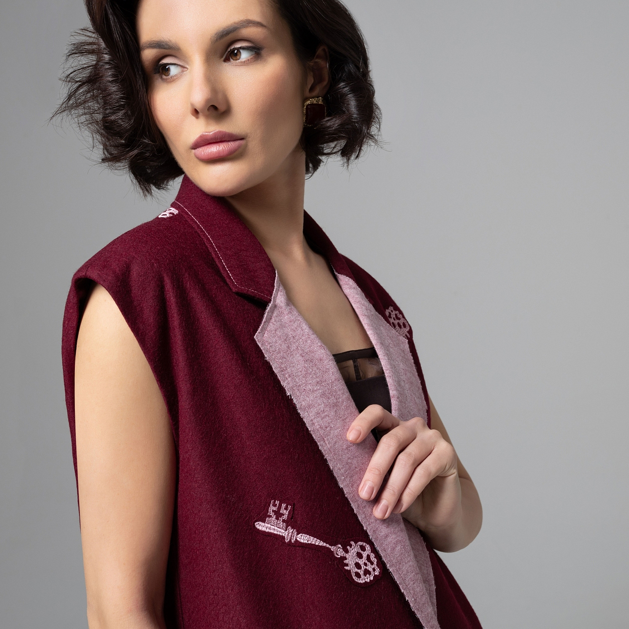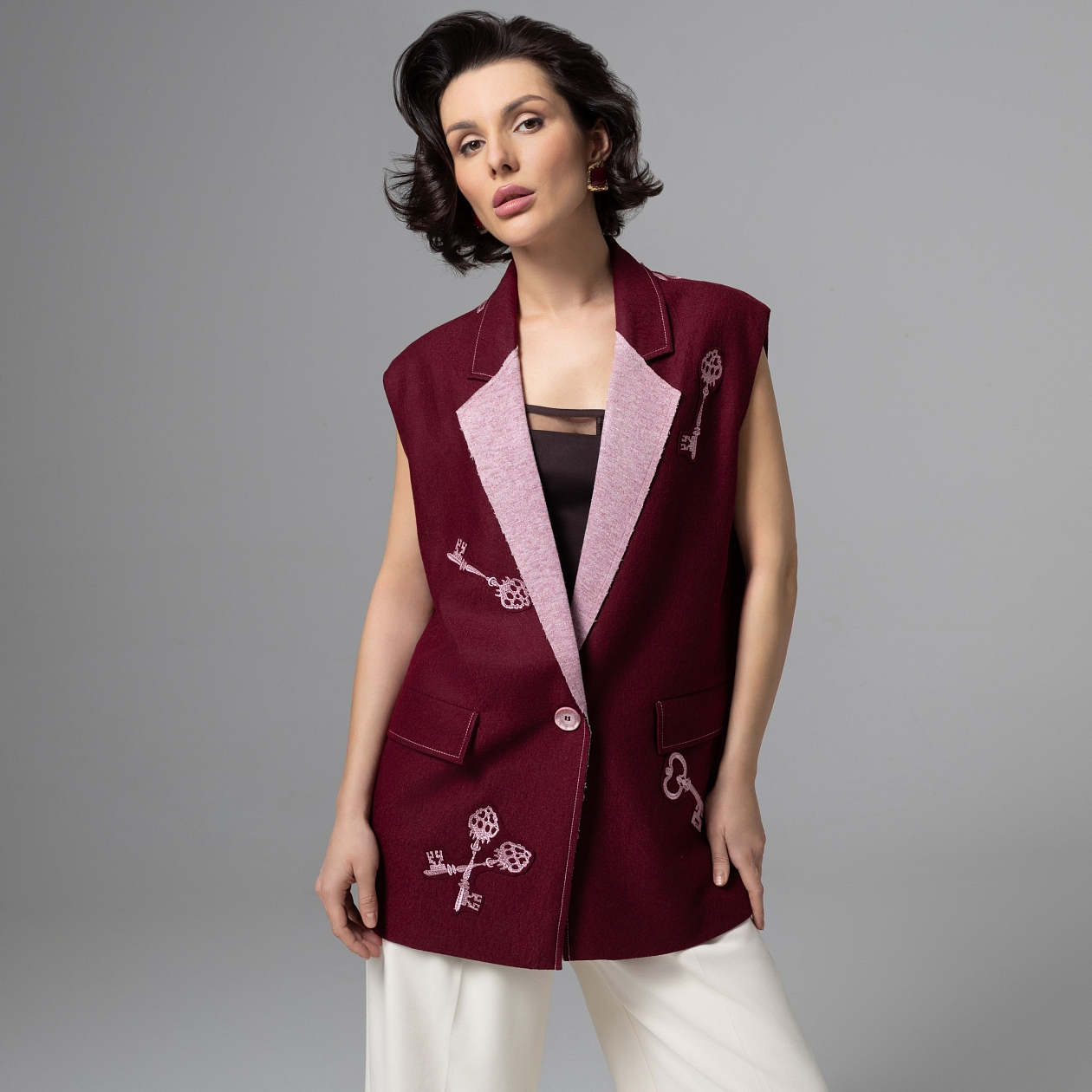 Где подписывают многомиллионные контракты? Там, где ты! Глубокий винный оттенок, мягкий меланж на лацканах и вышивка создают сюжет: у вас буквально в руках все ключи от новых дверей. Носите его с белыми брюками, узкими джинсами или лаконичным платьем‑комбинацией – и любой базовый комплект превращается в образ женщины, для которой повышение и путешествия бизнес‑классом не мечта, а обычное дело.