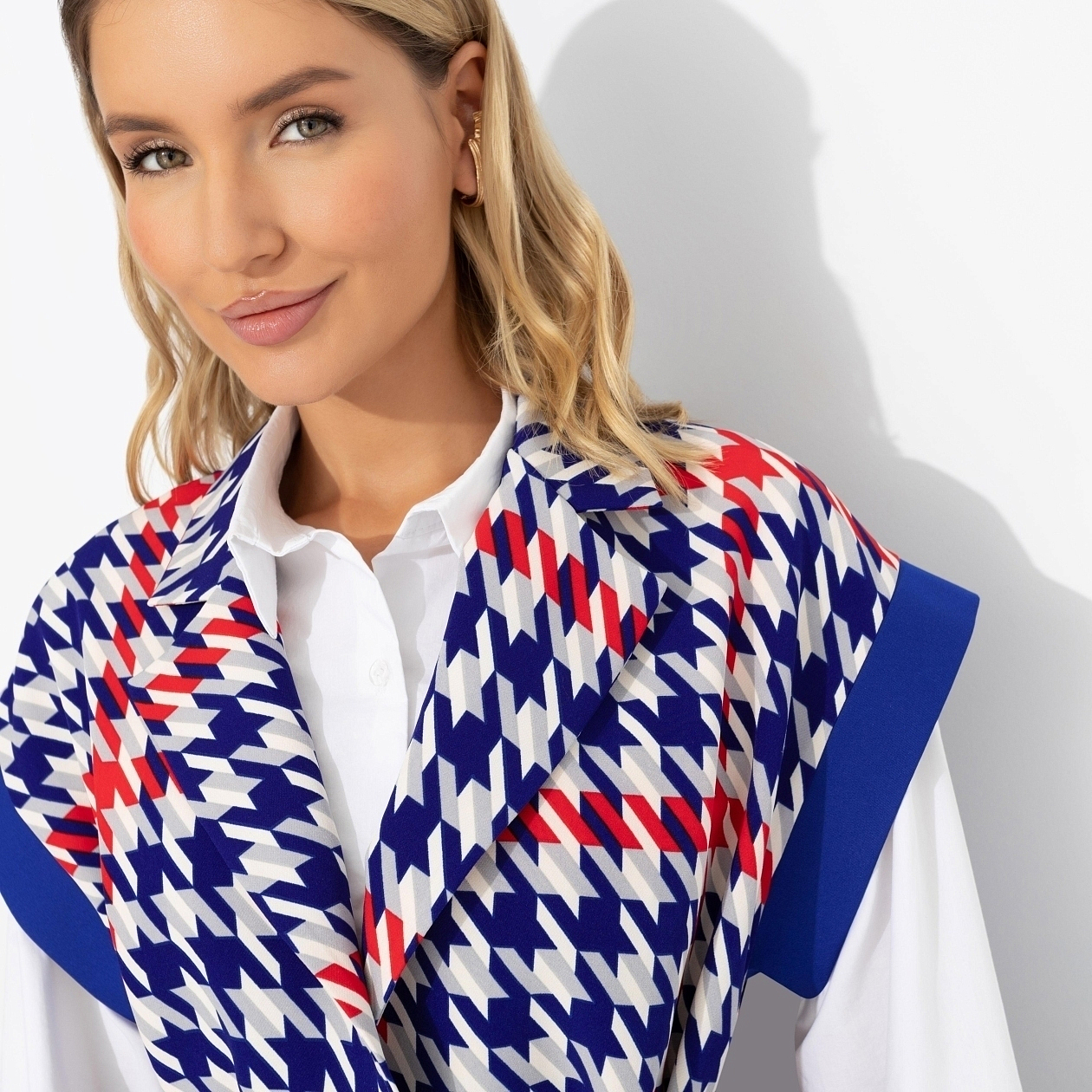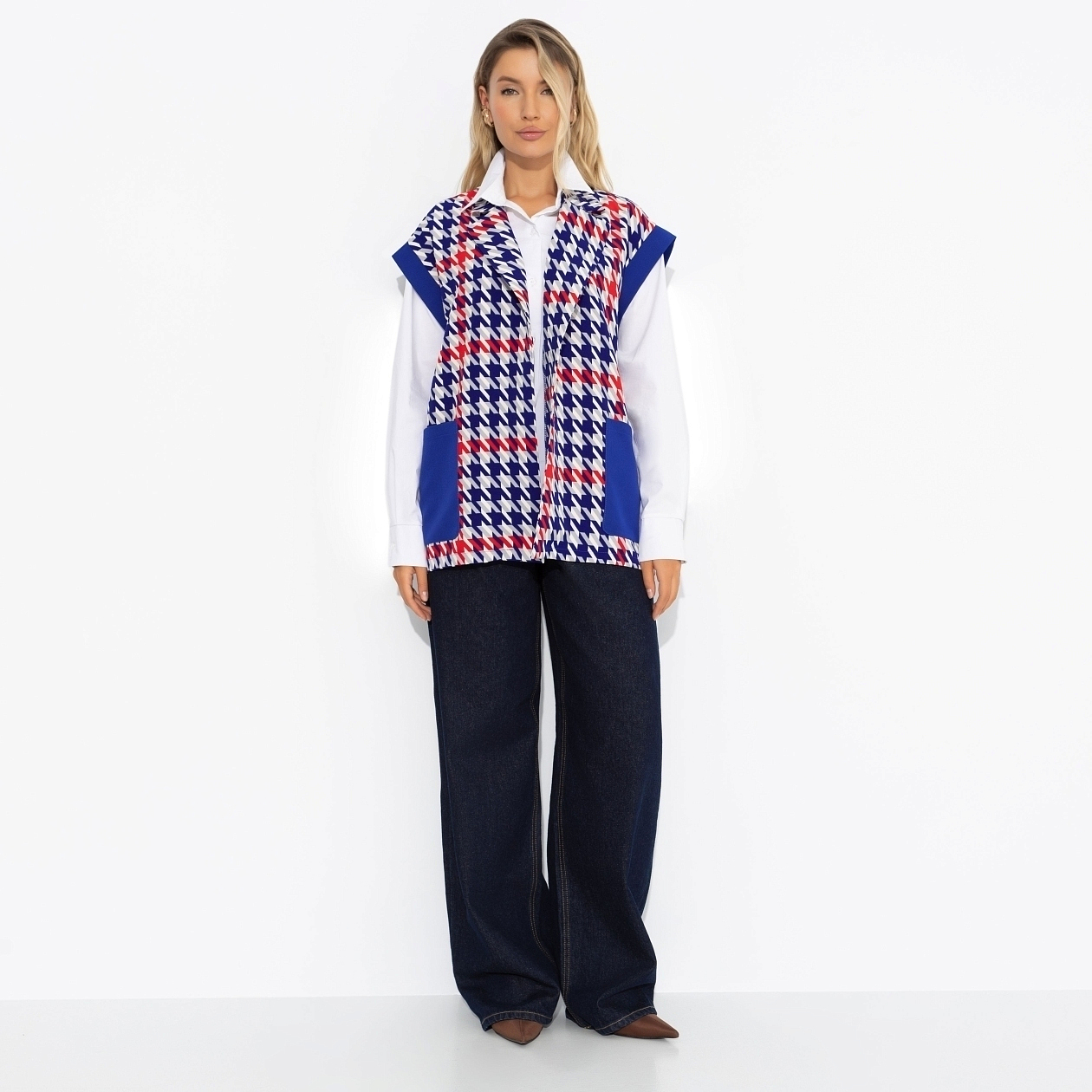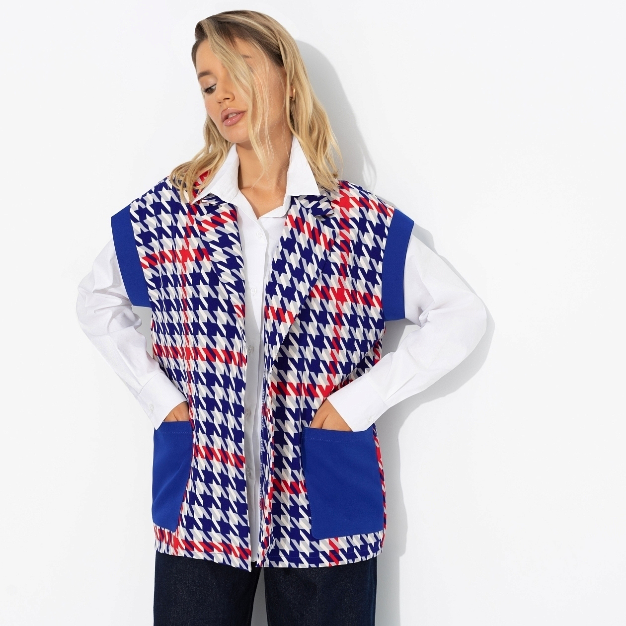 Вы встретились с подругами на обед. Жилет ЧАРУТТИ сразу стал темой для разговора за столиком в кафе. Ты надела его поверх простой футболки и вывела свой образ в топ. Подруги наперебой спрашивали, где ты приобрела такую модную вещь, а ты лишь загадочно улыбалась. Жилет прямого силуэта с лацканами. Свободный крой. Объемные карманы контрастного цвета по передней части изделия. Удлиненная линия плеча. Отвороты по окантовке плеча прошиты. Есть пояс в тон основного материала изделия.