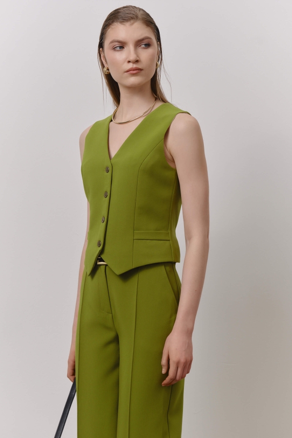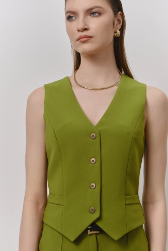 Жилет из костюмного полотна. Модель полуприлегающего силуэта с рельефами по переду, декоративной листочкой и фигурным низом. Застежка на пуговицы, на спинке хлястик с завязками.