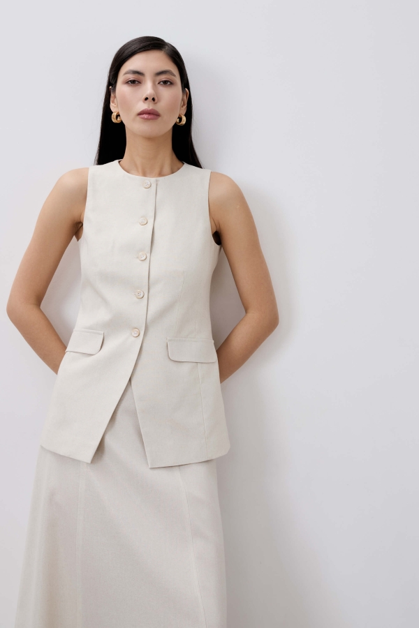 Жилет полуприлегающего силуэта из льна с напылением. По переду функциональная застежка на петли и акцентные пуговицы, имитация карманов с клапанами. По спинке рельефы.