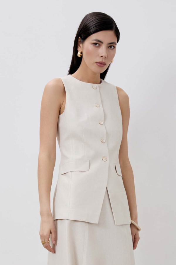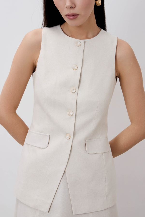 Жилет полуприлегающего силуэта из льна с напылением. По переду функциональная застежка на петли и акцентные пуговицы, имитация карманов с клапанами. По спинке рельефы.