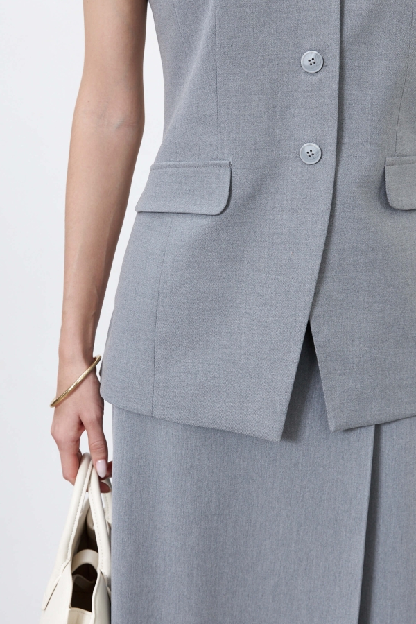 Жилет полуприлегающего силуэта из костюмного полотна. По переду функциональная застежка на петли и акцентные пуговицы, имитация карманов с клапанами. По спинке рельефы.