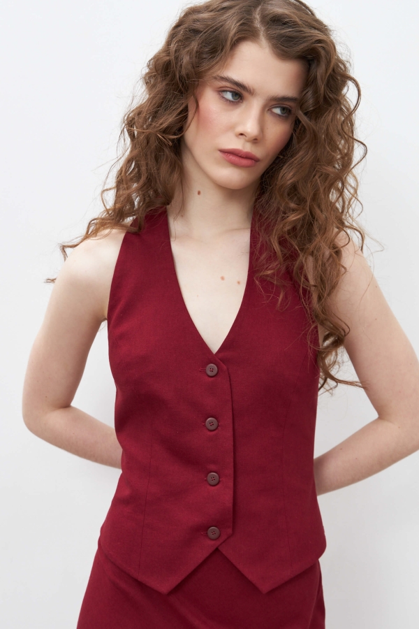 Жилет из льна с открытой спинкой. Модель прилегающего силуэта с открытой спиной.По переду застежка на петли и пуговицы. По спинке рельефы и хлястик-регулятор с металлической пряжкой. На подкладе.