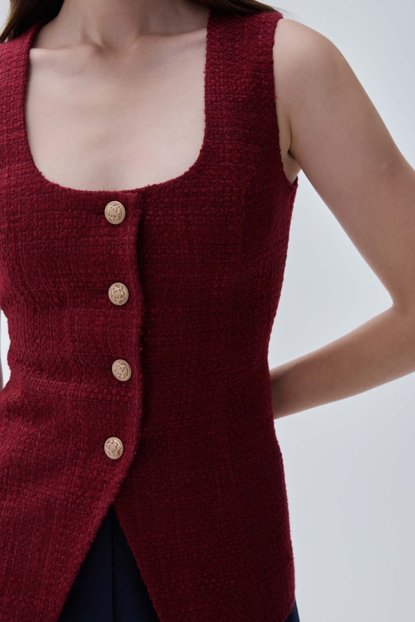 Элегантный жилет из твидового полотна в трендовом оттенке. Прилегающий жилет с квадратный вырезом по горловине, застежка на петли и акцентные пуговицы. Изделие на подкладке из поливискозы.