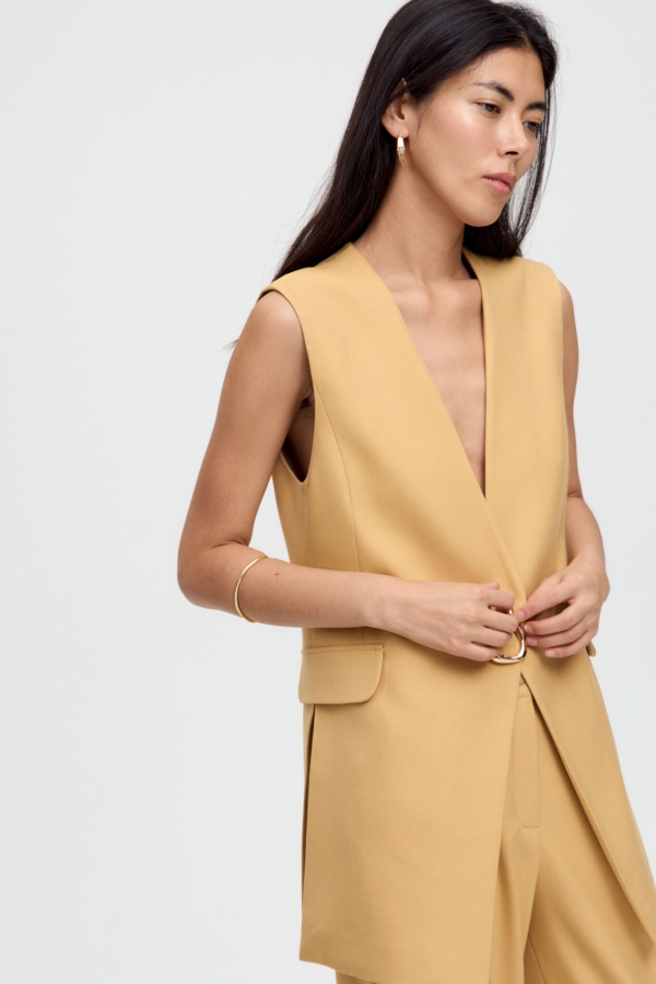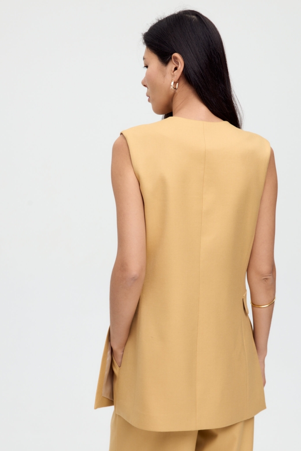 Жилет из костюмного полотна высокого качества с акцентной брошью. Модель свободного силуэта, с выраженной линии талии. В боковых швах эффектные разрезы и декоративные клапаны. Застежка на кнопку и декоративную брошь.