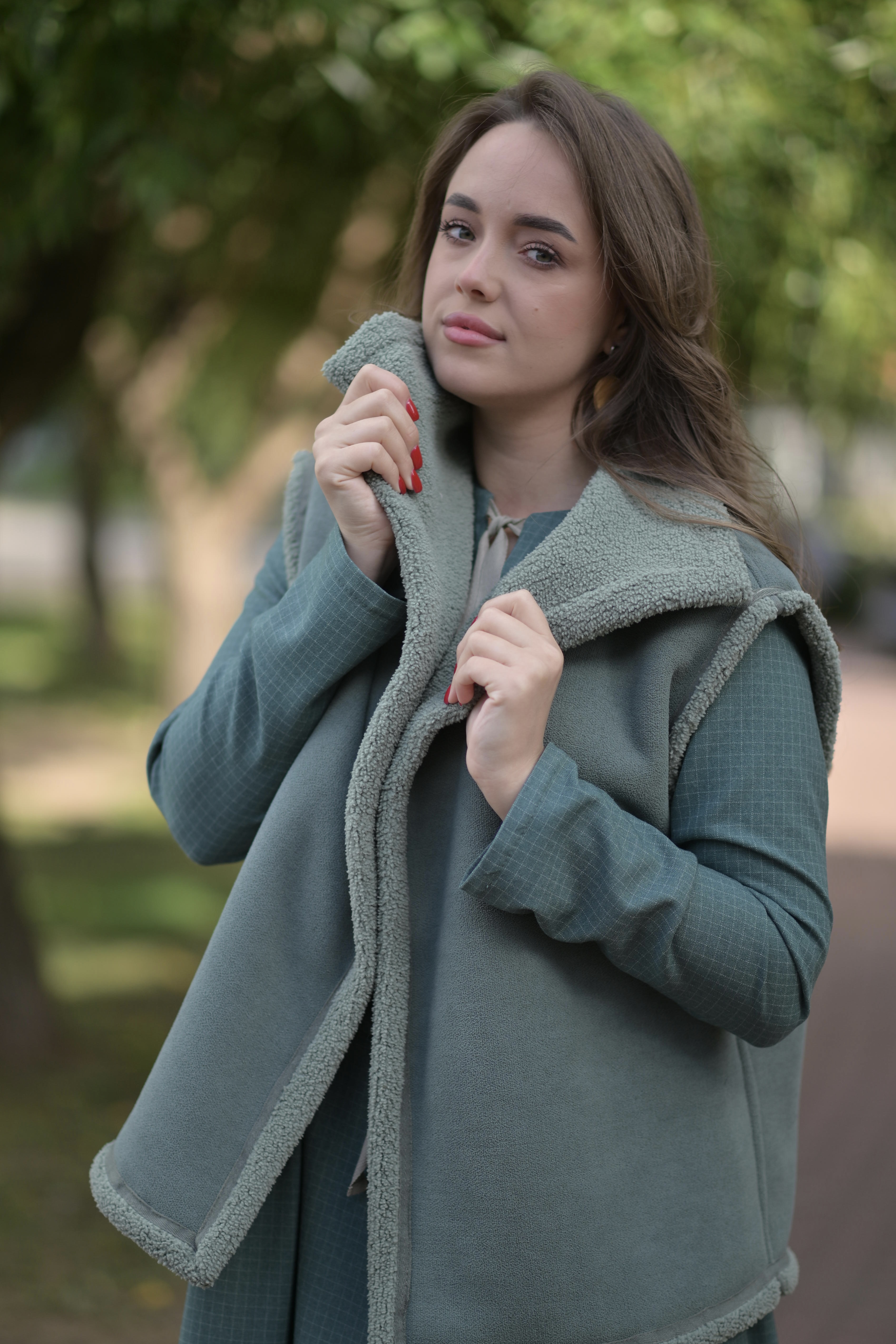 Повседневный жилет теплый выполнен в модели кимоно, что делает его универсальным аксессуаром для ежедневного ношения, офисной работы и спортивных активностей. Безрукавная конструкция жилетки обеспечивает удобство и легкость в одевании. Материал безрукавки сочетает в себе вискозу и полиэстер, что придаёт дубленке уникальную фактуру и долговечность. Отсутствие декоративных элементов и карманов делает его лаконичным и элегантным. Особенностью данной жилетки является её двусторонний дизайн, что позволяет носить жилетку с двух сторон, меняя образы. Все швы жилета обработаны декоративной киперной лентой.