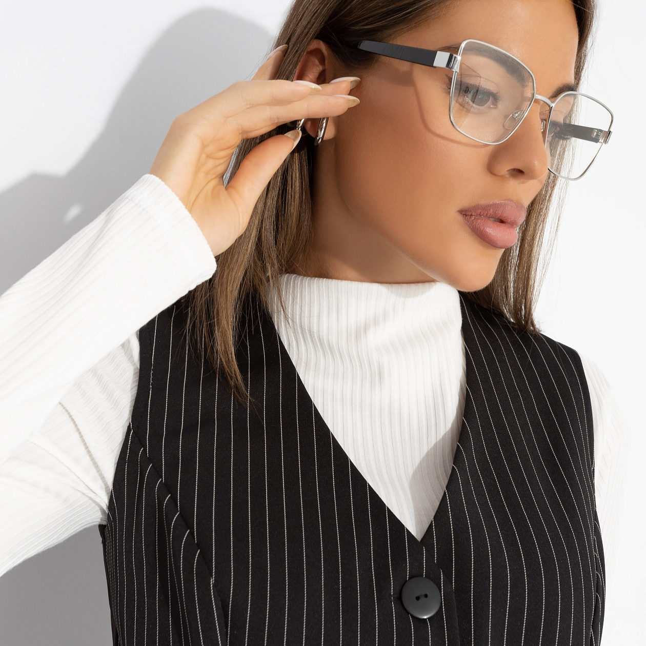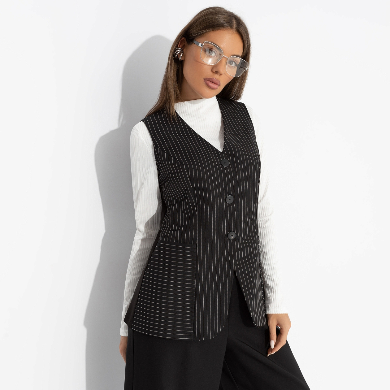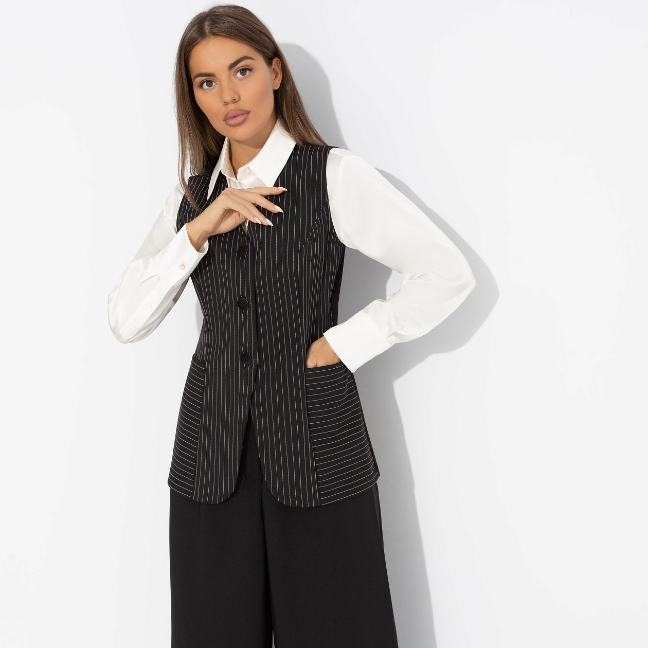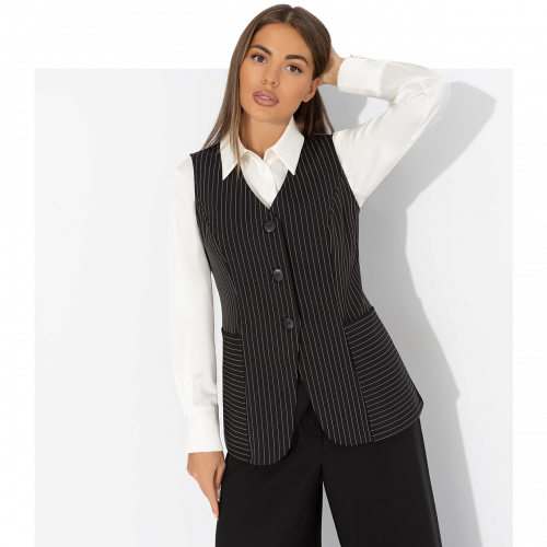 Тонкая контрастная полоска жилета ЧАРУТТИ – не просто принт. Это визуальная метафора: баланс между смелостью и элегантностью, между офисом и вечеринкой. Надень жилет поверх блузы или с голыми плечами и пусть каждый поймёт – перед ним человек, который диктует правила. Жилет приталенного силуэта, удлиненный. Изделие с карманами. Акцентный короткий ремешок по спинке изделия.