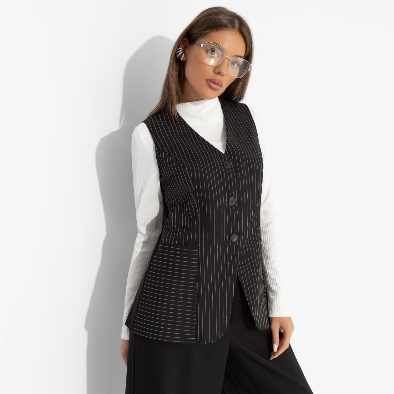 Тонкая контрастная полоска жилета ЧАРУТТИ – не просто принт. Это визуальная метафора: баланс между смелостью и элегантностью, между офисом и вечеринкой. Надень жилет поверх блузы или с голыми плечами и пусть каждый поймёт – перед ним человек, который диктует правила. Жилет приталенного силуэта, удлиненный. Изделие с карманами. Акцентный короткий ремешок по спинке изделия.