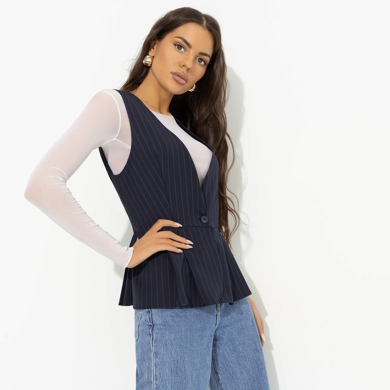 Первый в истории моды жилет, который разбил сердце. При чем не одно. Уникальный крой и выверенный вырез зоны декольте не оставит равнодушным ни одного прохожего. Готовы взять на себя такую ответственность? Жилет приталенного силуэта. Без лацканов. Застегивается на одну пуговицу. Подол оформлен баской. Хорошо смотрится, как самостоятельный предмет гардероба и как второй слой.