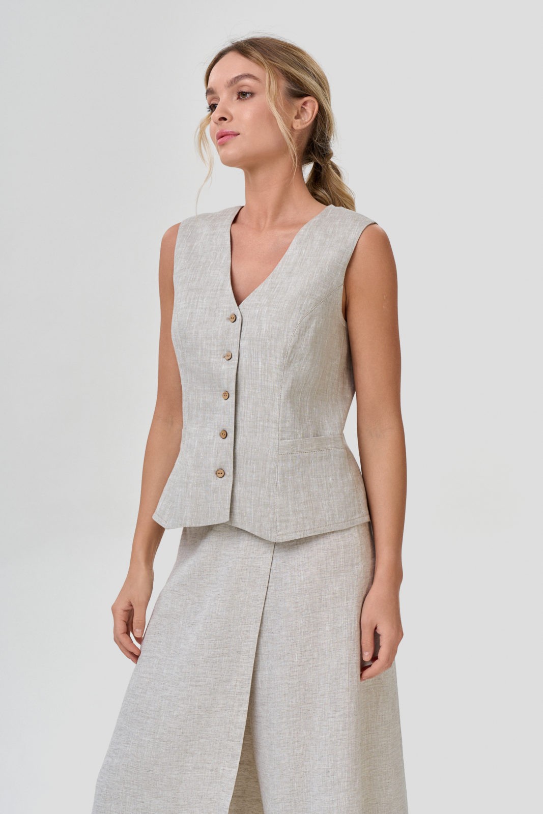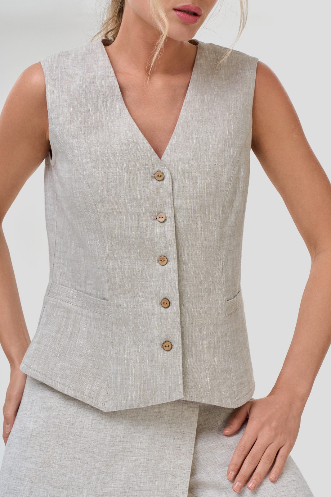 Жилет классический прилегающего силуэта с рельефами. Застежка центральная на  пуговицы. Горловина V- образной формы. Низ переда фигурный.