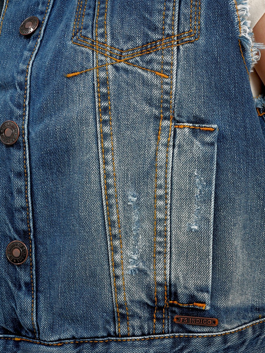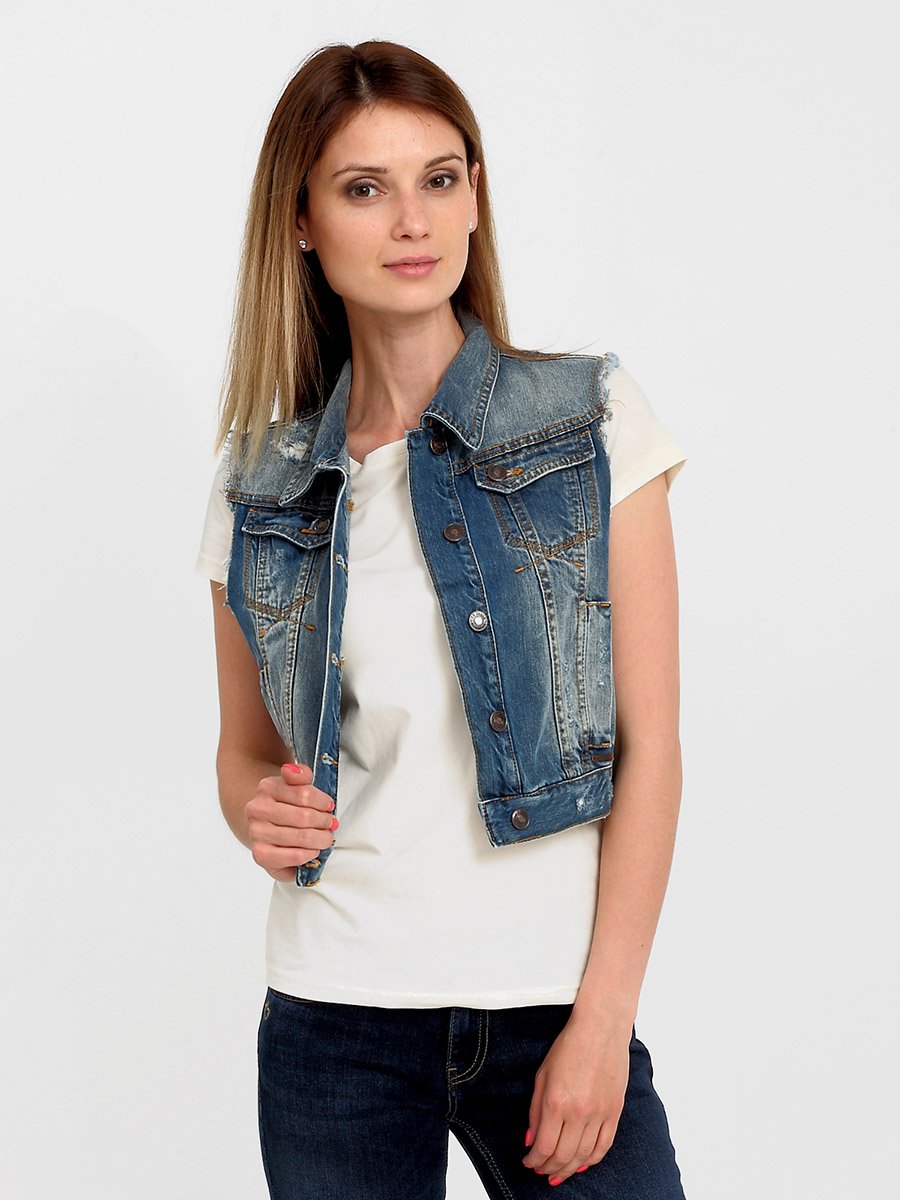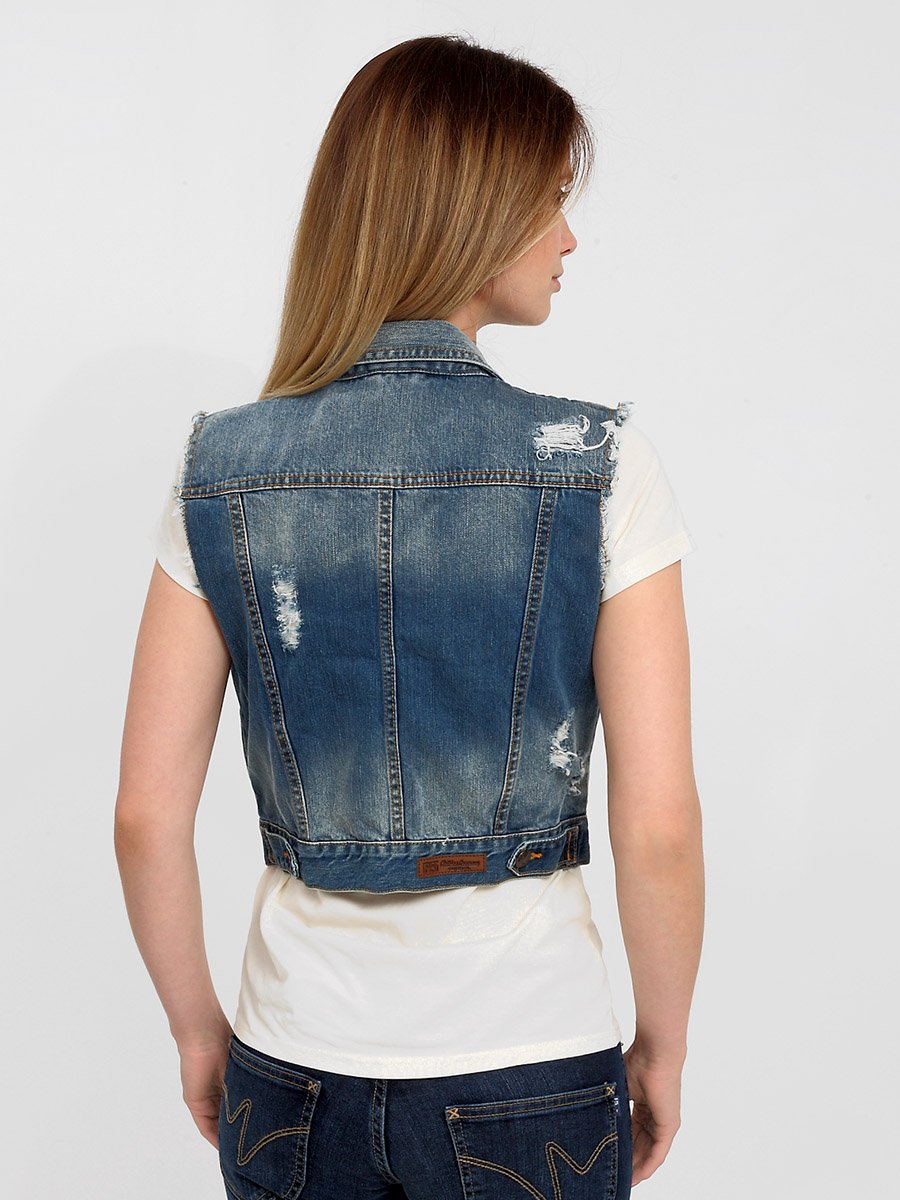 Стильный джинсовый жилет. Зауженый силуэт Slim fit. Свободная пройма, небольшой воротник; на груди  карманы с  клапаном, застегивающимся  на  пуговицу; боковые  карманы; на  поясе по бокам куртки хлястики застегивающиеся  на  пуговицу. Выполнен 100% хлопковой ткани denim . Специальная средняя стирка с потертостями спереди и спереди и  сзади, баромой  по пройме, а также локальными повреждениями ткани  и дырками  в нескольких местах на полочке  и спинке  жилета.