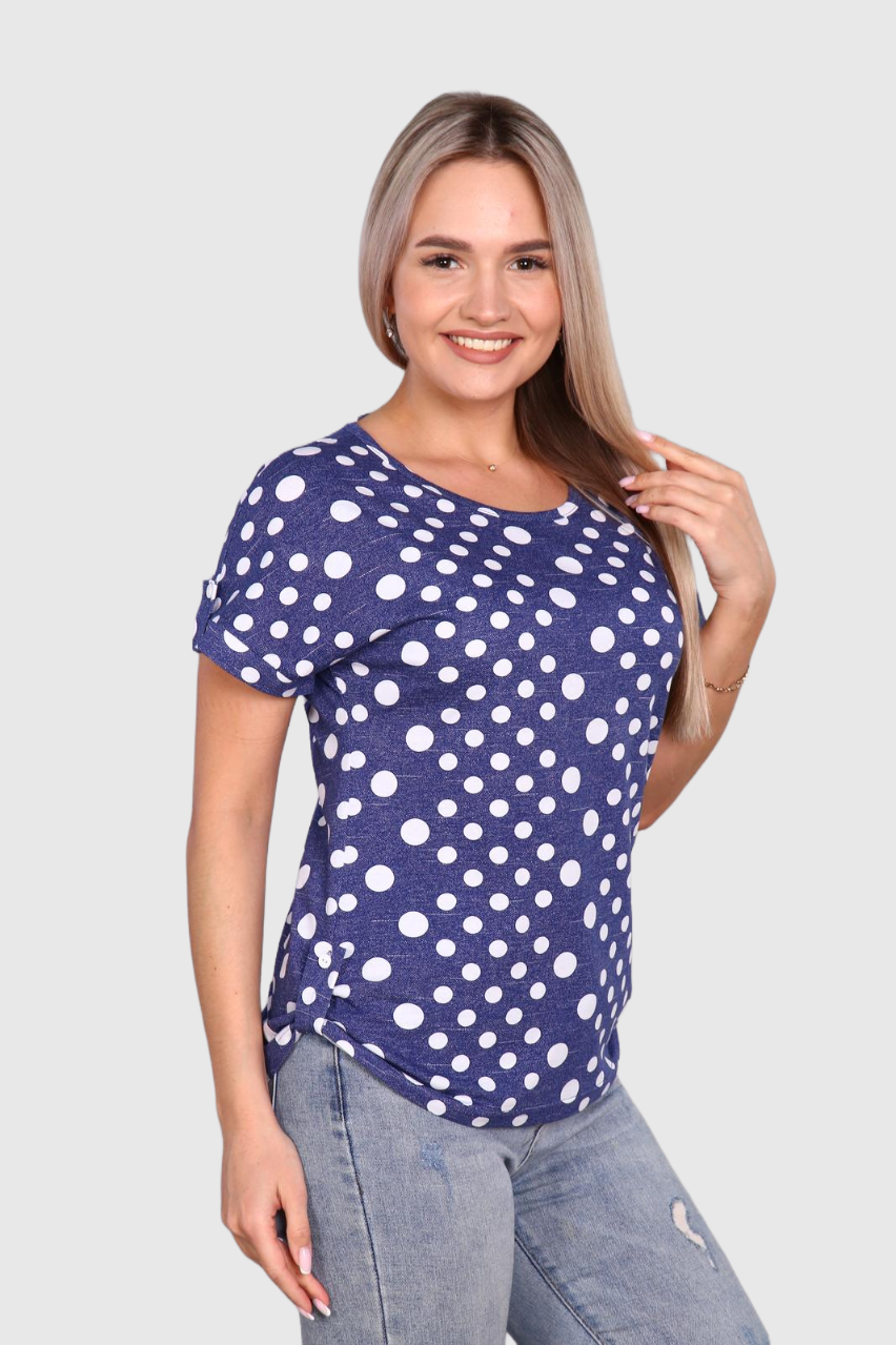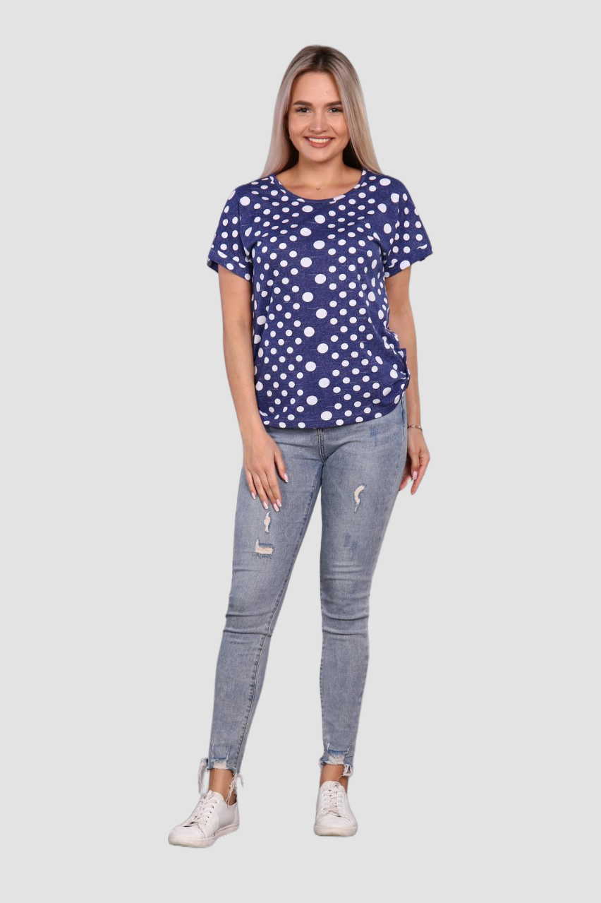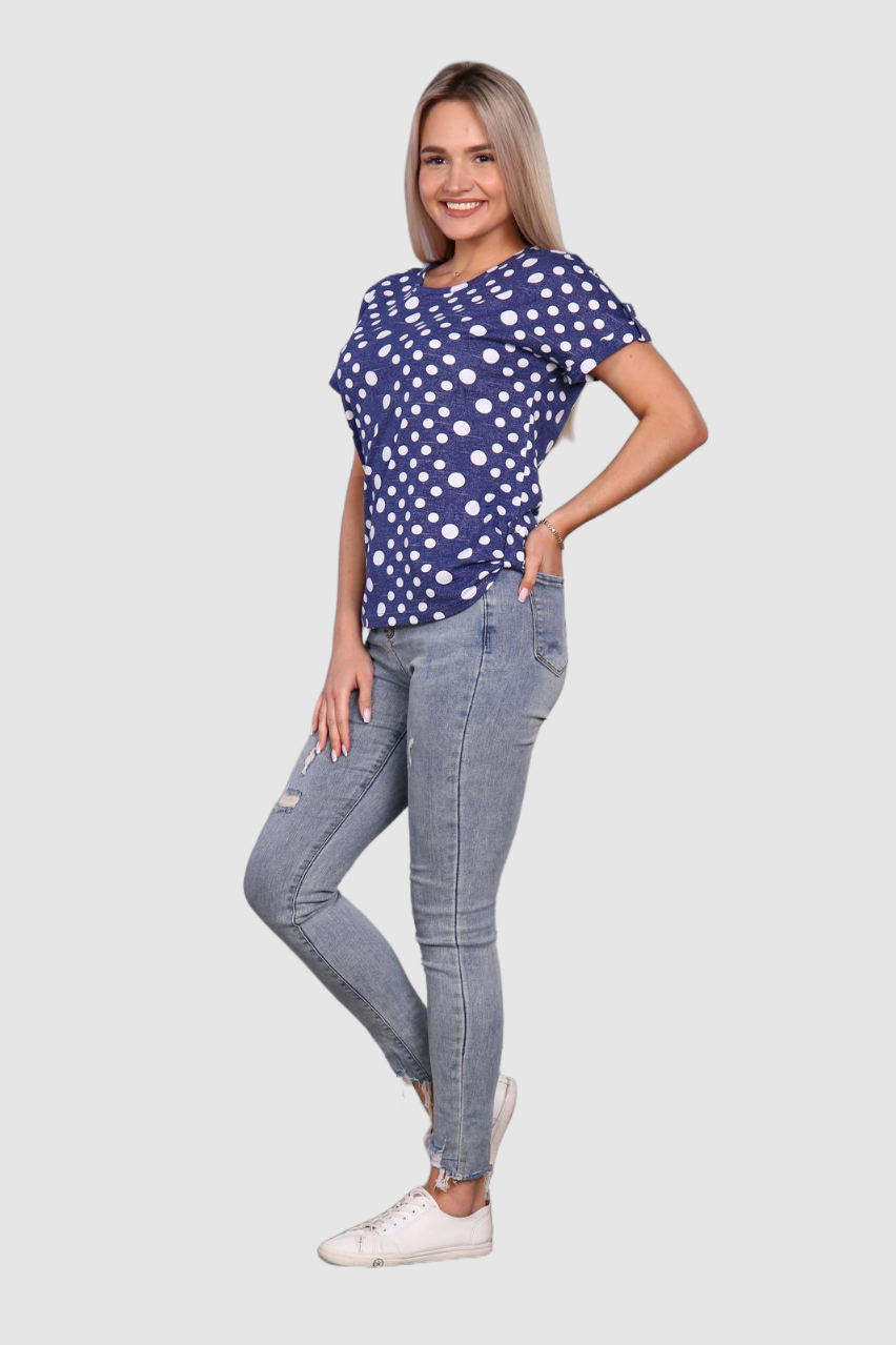Легкая футболка свободного кроя с округлым вырезом горловины. Низ рукава с отложными манжетами и декоративными патами с пуговицами. Также паты с пуговицами по низу изделия. Эффектная модель, которая подчёркивает достоинства фигуры. Хорошо сочетается с классическими брюками, джинсами, юбками и жакетами. Материал изделия хорошо держит форму и приятен к телу.