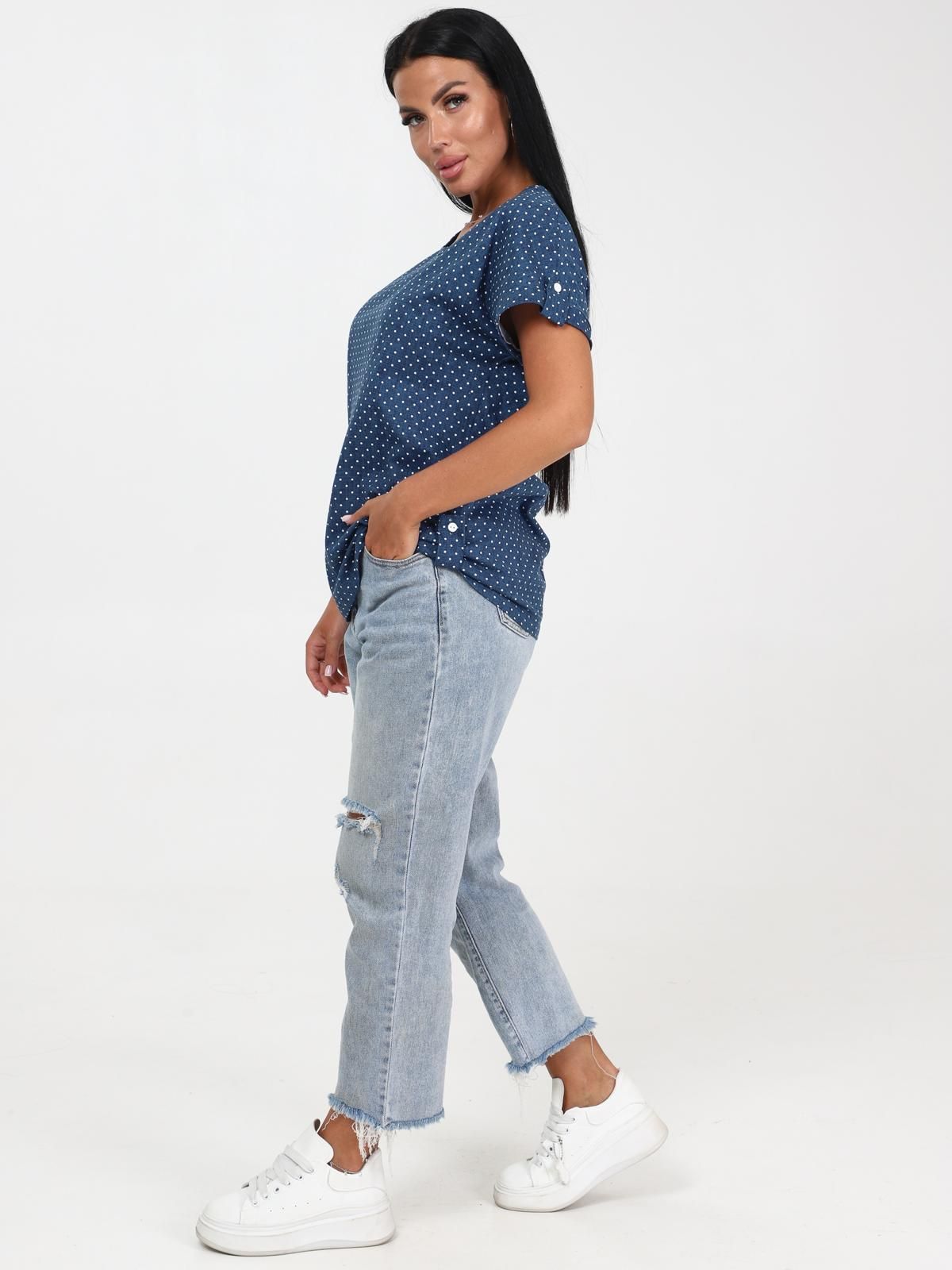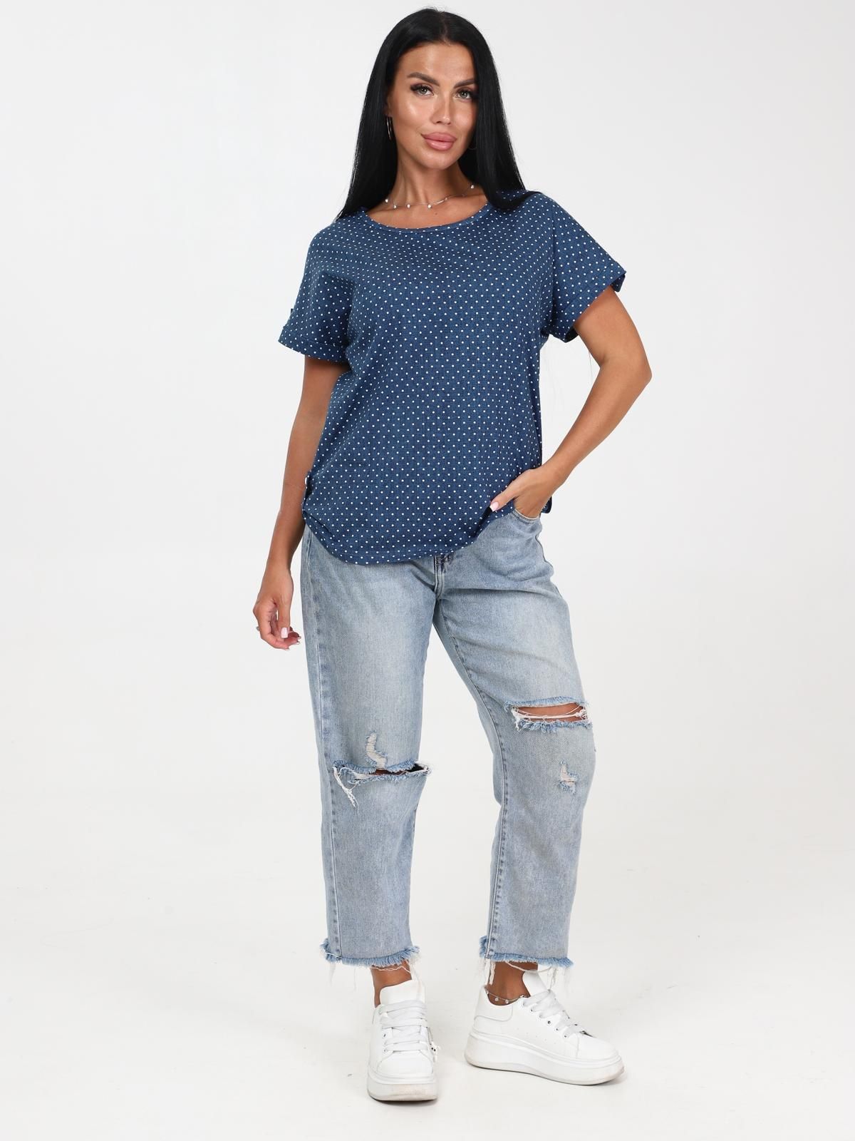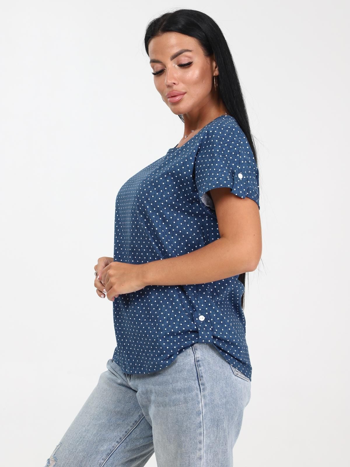 Легкая футболка свободного кроя с округлым вырезом горловины. Низ рукава с отложными манжетами и декоративными патами с пуговицами. Также паты с пуговицами по низу изделия. Эффектная модель, которая подчёркивает достоинства фигуры. Хорошо сочетается с классическими брюками, джинсами, юбками и жакетами. Материал изделия хорошо держит форму и приятен к телу.