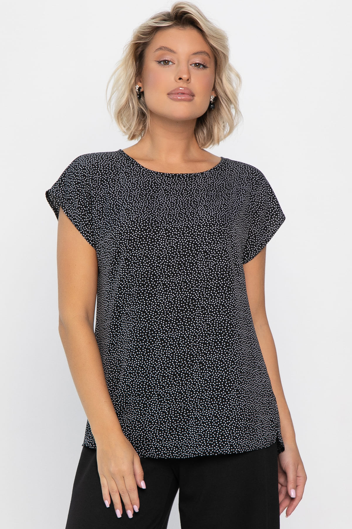 Блуза является базовой вещью для женского гардероба. Полуприлегающий крой создаёт аккуратный силуэт, подходящий как для офиса, так и для повседневной носки. Блуза с округлым вырезом, небольшими разрезами по бокам прекрасно смотрится на женщинах любой комплекции и позволяет чувствовать себя комфортно. Короткие цельнокроеные рукава добавляют образу лёгкости и оригинальности. К этой блузке подойдут различные варианты низа — юбки, брюки.