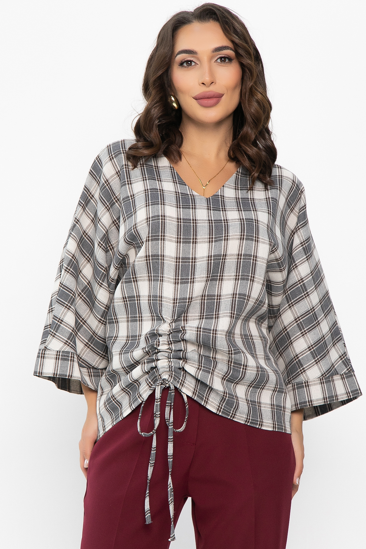 Блузка свободного кроя в клетку — это то, что вам нужно! V-образный вырез подчеркнёт вашу шею, а цельнокроеные рукава с манжетами придадут образу элегантности. Блузка украшена кулиской спереди — это изящная деталь, которая сделает ваш образ неповторимым. Блузка идеально подойдёт для прогулок, встреч с друзьями или уютных вечеров дома. Позвольте себе быть яркой и стильной с нашей оригинальной женской блузкой!
